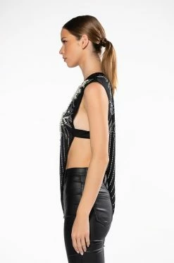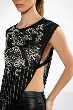 The AKIRA Label If I Was A Rich Girl Asymmetrical Rhinestone Embellished Blouse is made from a sheer mesh fabrication and features intricately patterned front and back rhinestone and pearl detailing, a rounded neckline, a one-sleeve design, an open side with a sheer mesh band, and an asymmetrical hem.