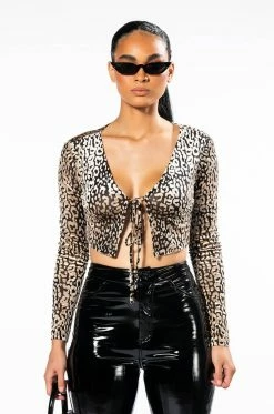 Make your way through fashionable terrain in The AKIRA Label Its A Jungle Out There Long Sleeve Tie Front Cardigan. This sheer velvet burnout piece features leopard print patterning throughout, a tie front neckline, long sleeves, and a cropped cut. Pair with leather trousers and pointy toe mules for a complete look.