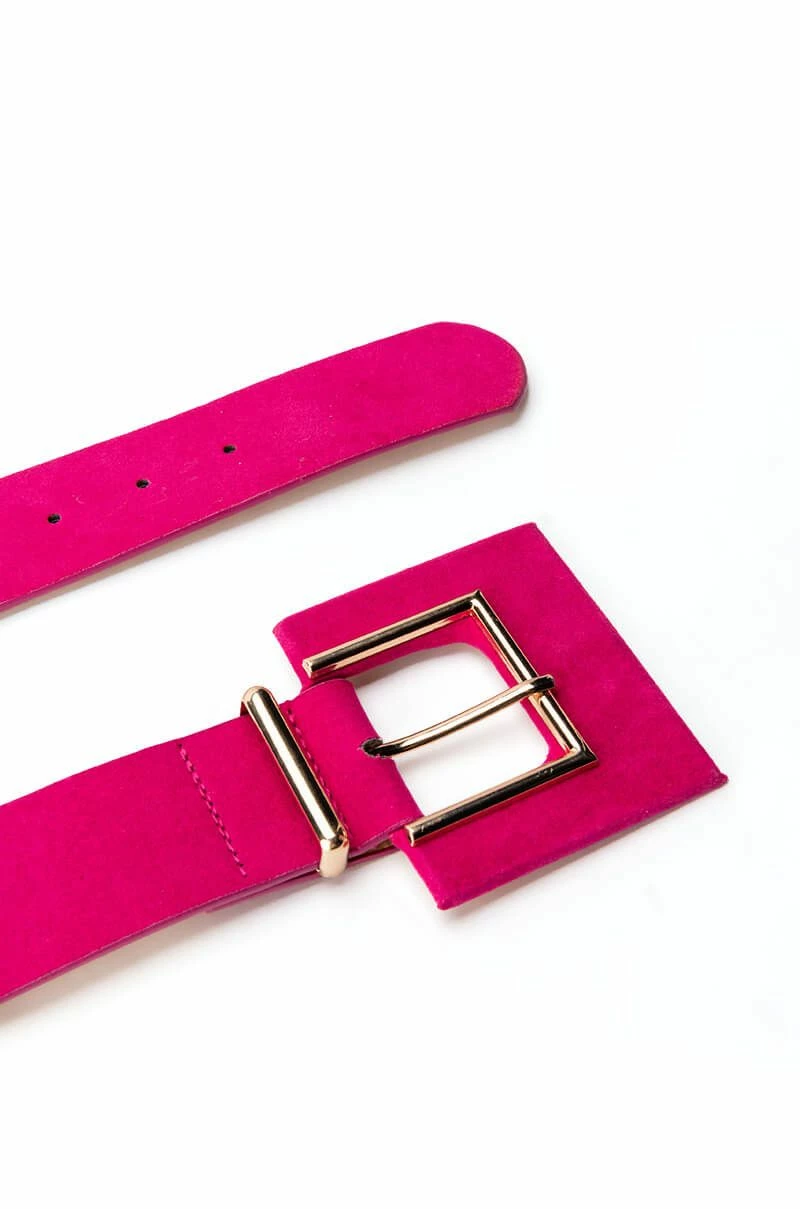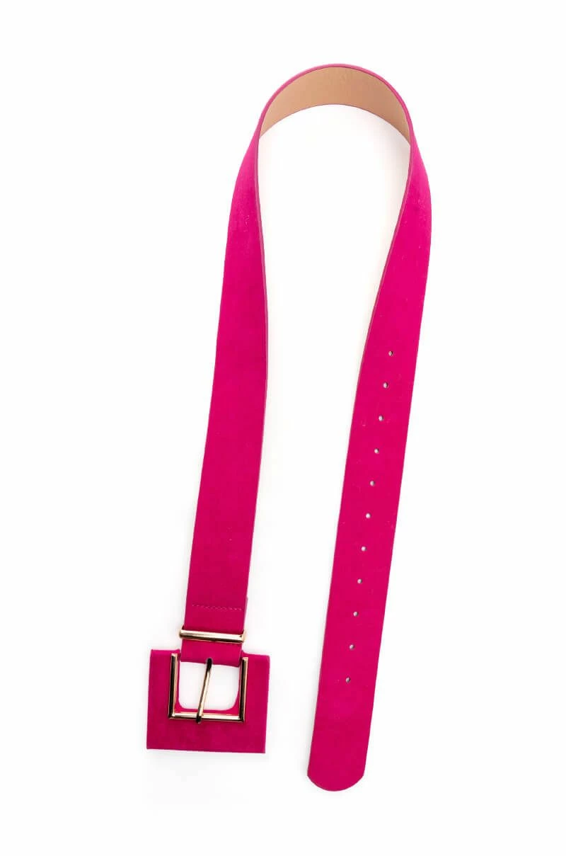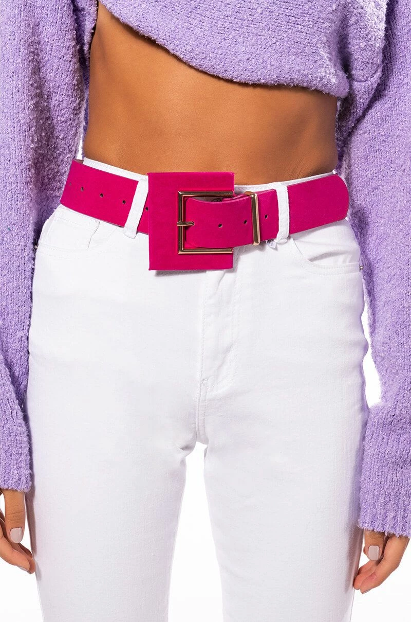 The AKIRA Label Itβs A Lewk Pink Suede Look Belt is a wide waist belt featuring a faux suede base, faux gold metallic detailing, a wide silhouette, and an oversized square buckle closure. This unique piece sits at the waist for a cinched look.