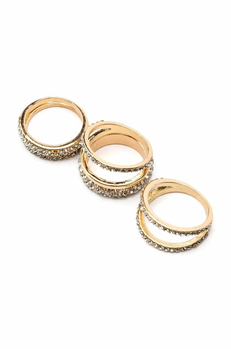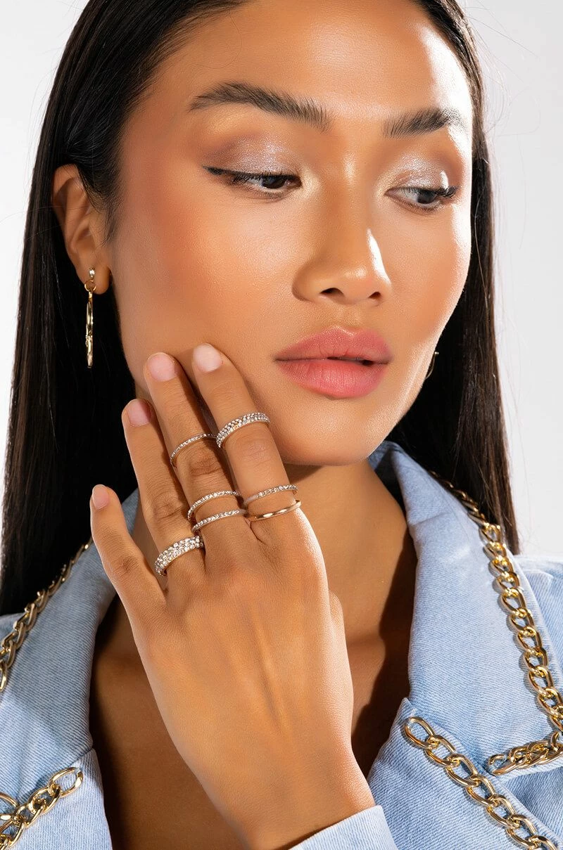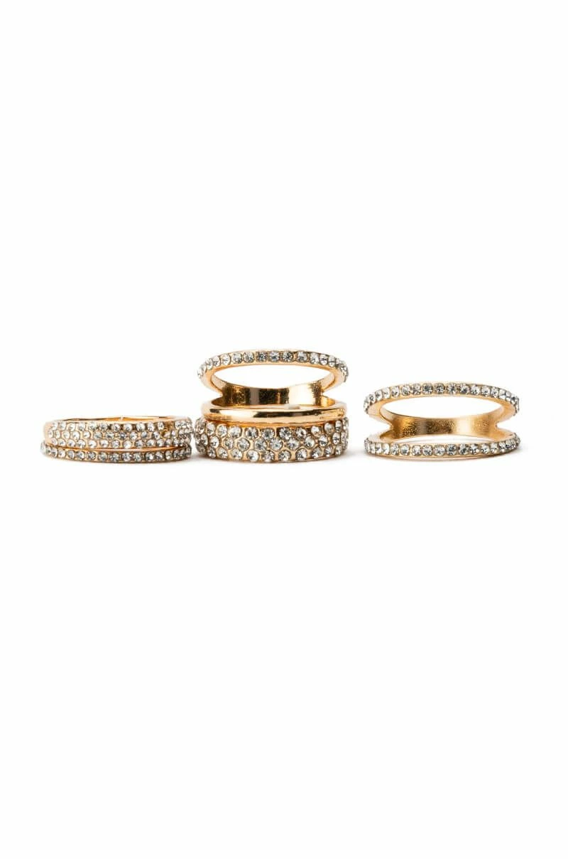 The AKIRA Label Ivy Pave Ring Set includes five rhinestone-embellished faux gold rings of various sizes, two with double bands. Stack them up or wear them individually to add some sparkle to your next going-out look!