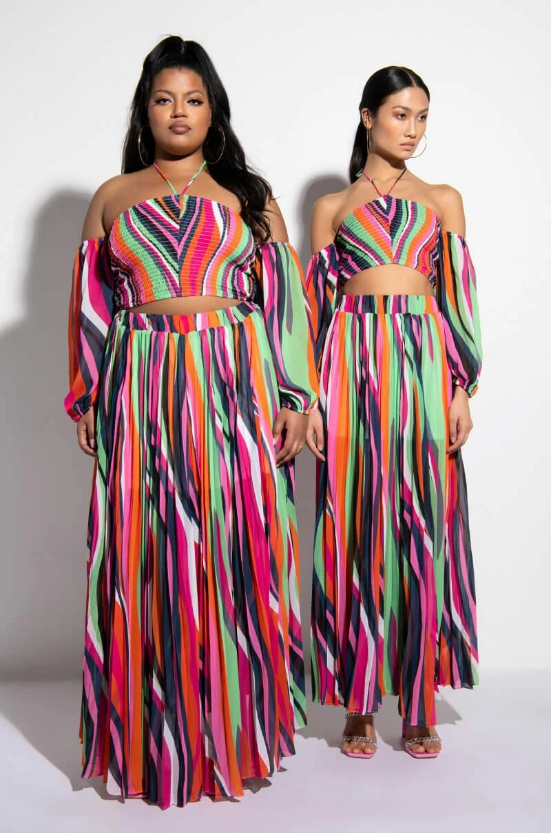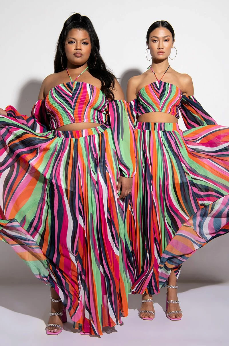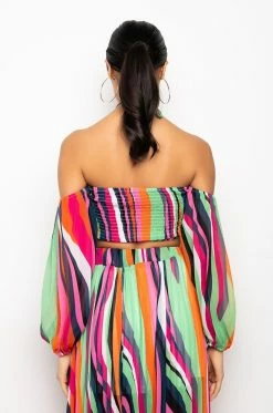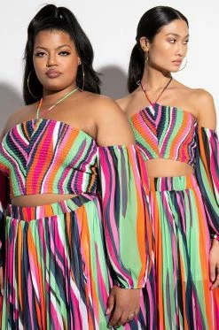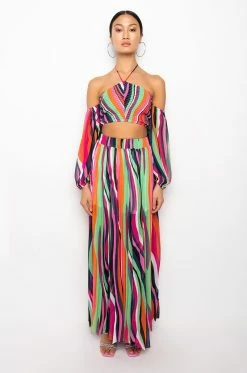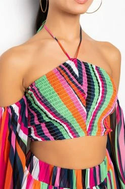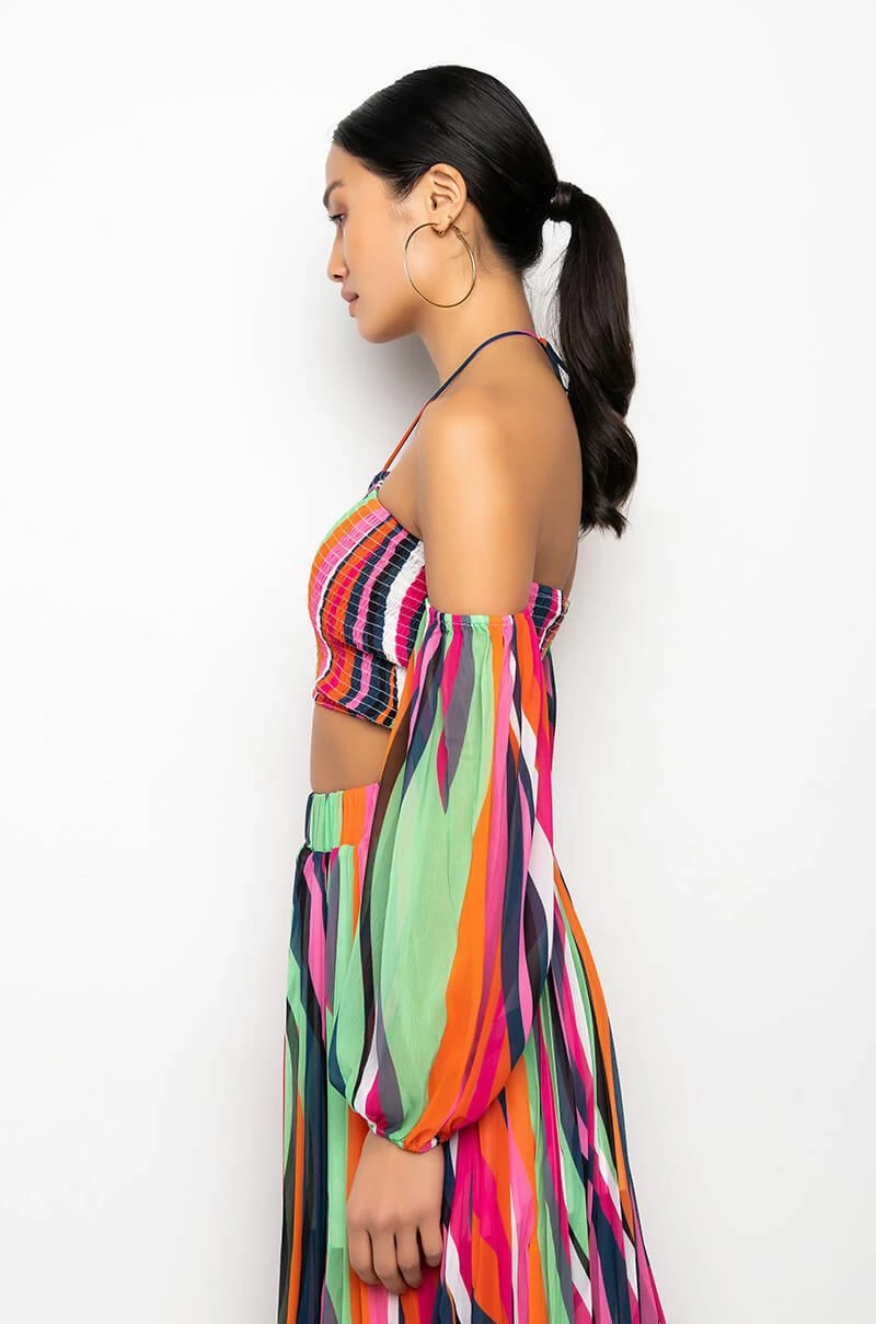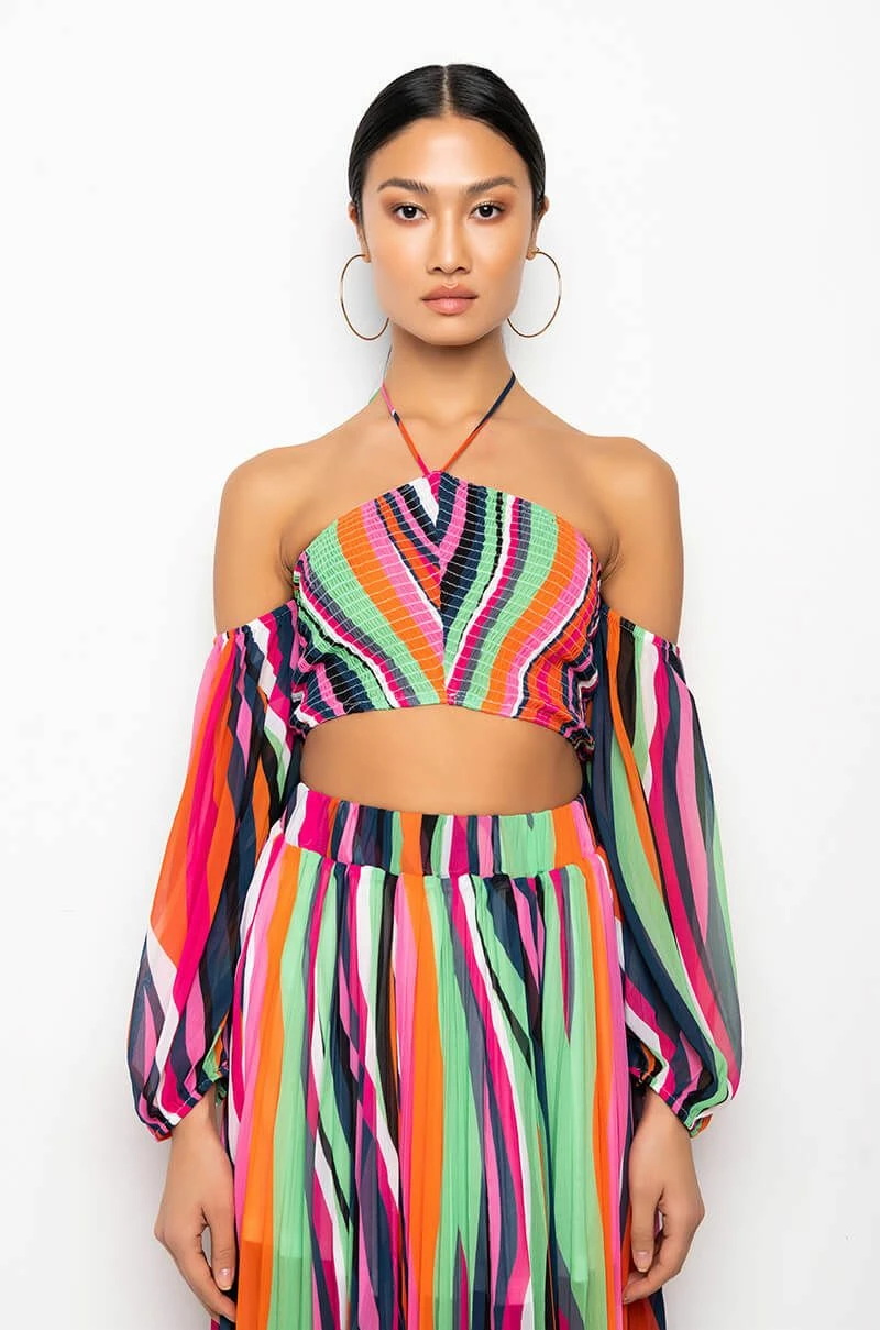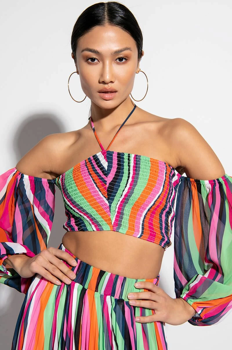 The AKIRA Label Ivy Smocked Halterneck Blouse is made from a smocked elastic base and features an off-the-shoulder fit, a pointed halter neckline with thin straps, long blouson sleeves with elastic detailing, multicolor striped patterning, and a cropped silhouette. Pair this piece with the matching AKIRA Label Ivy Flowy Maxi Skirt and some mules for a colorful vacay look!