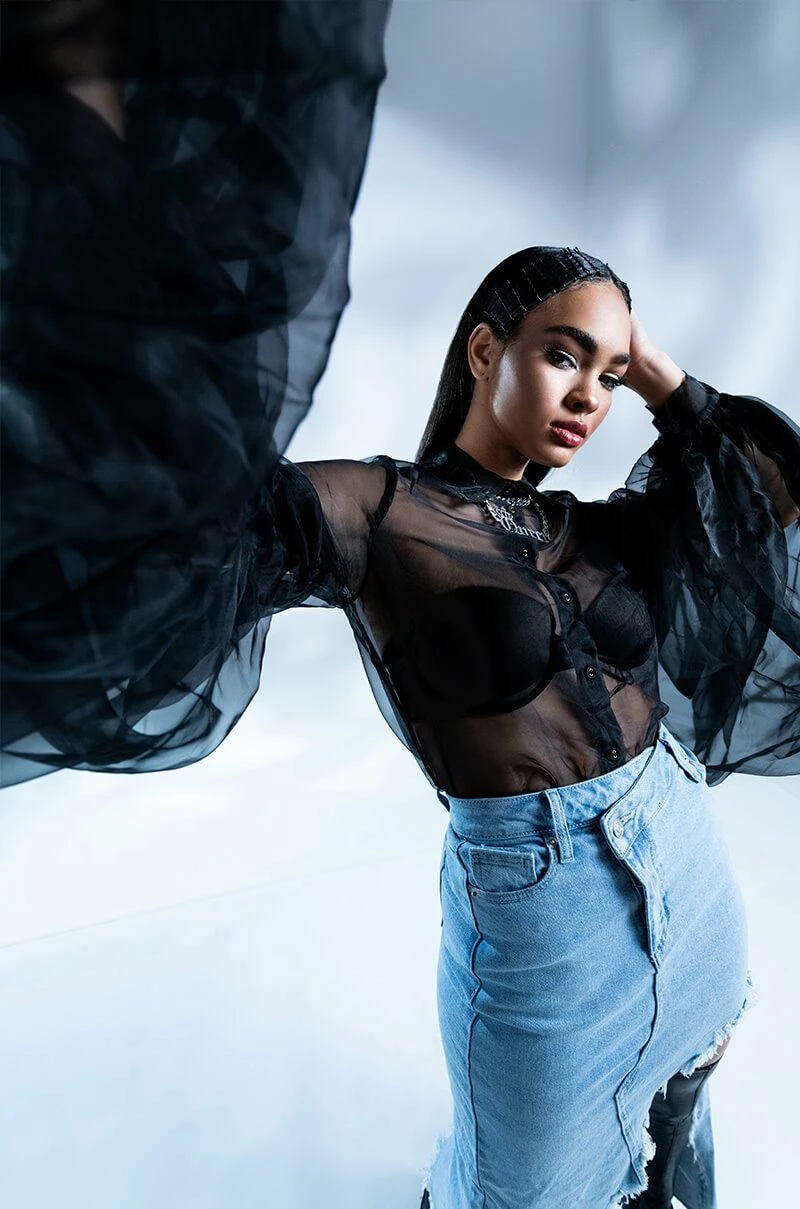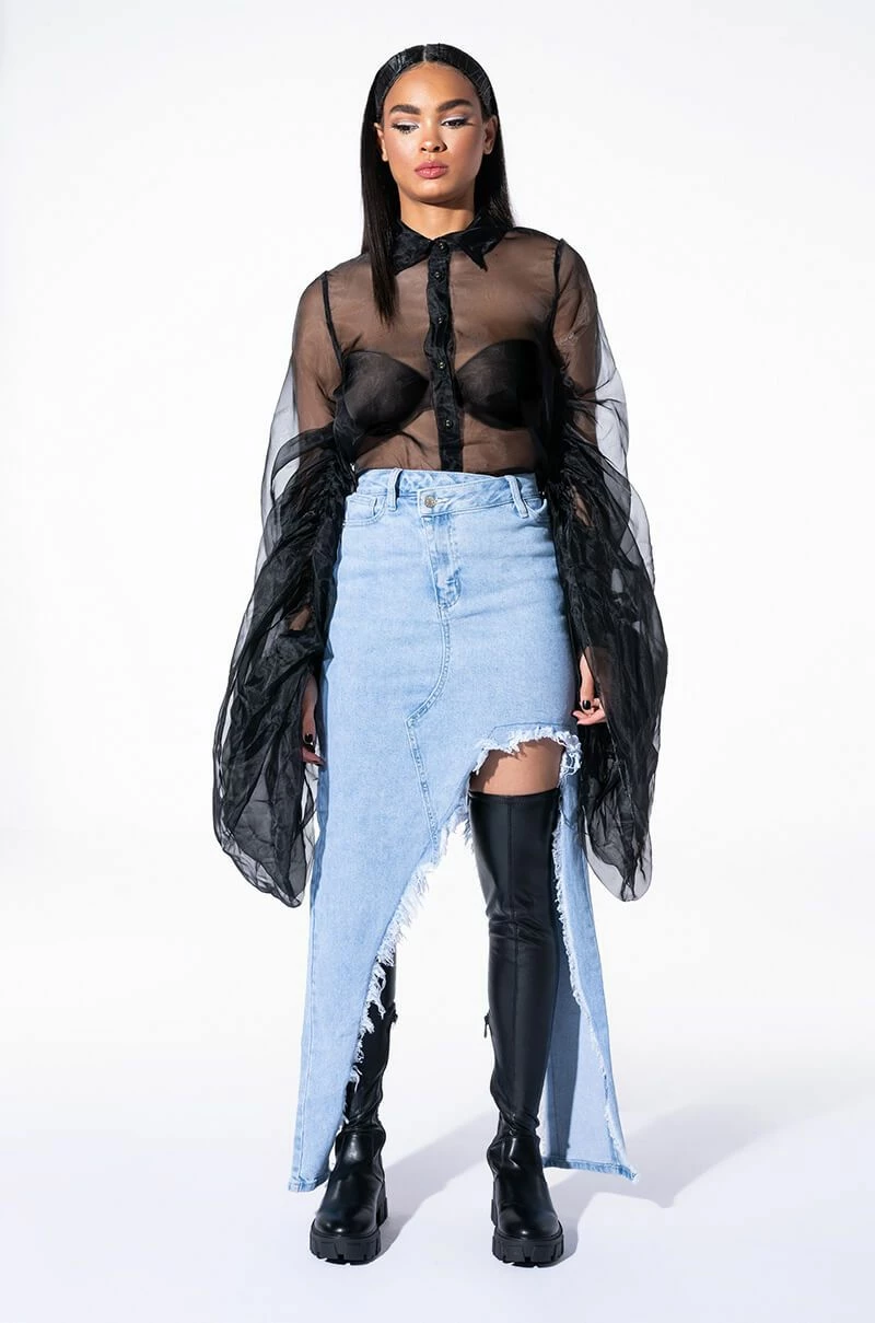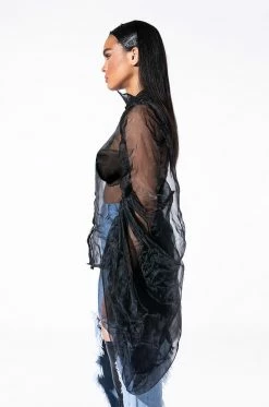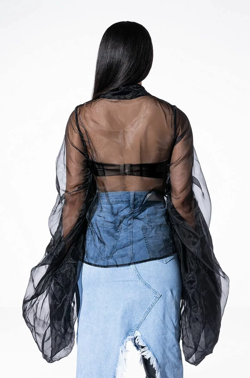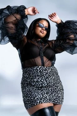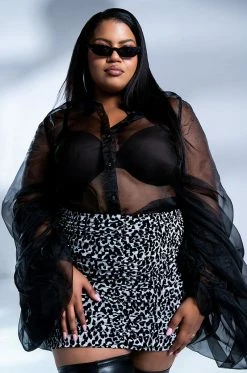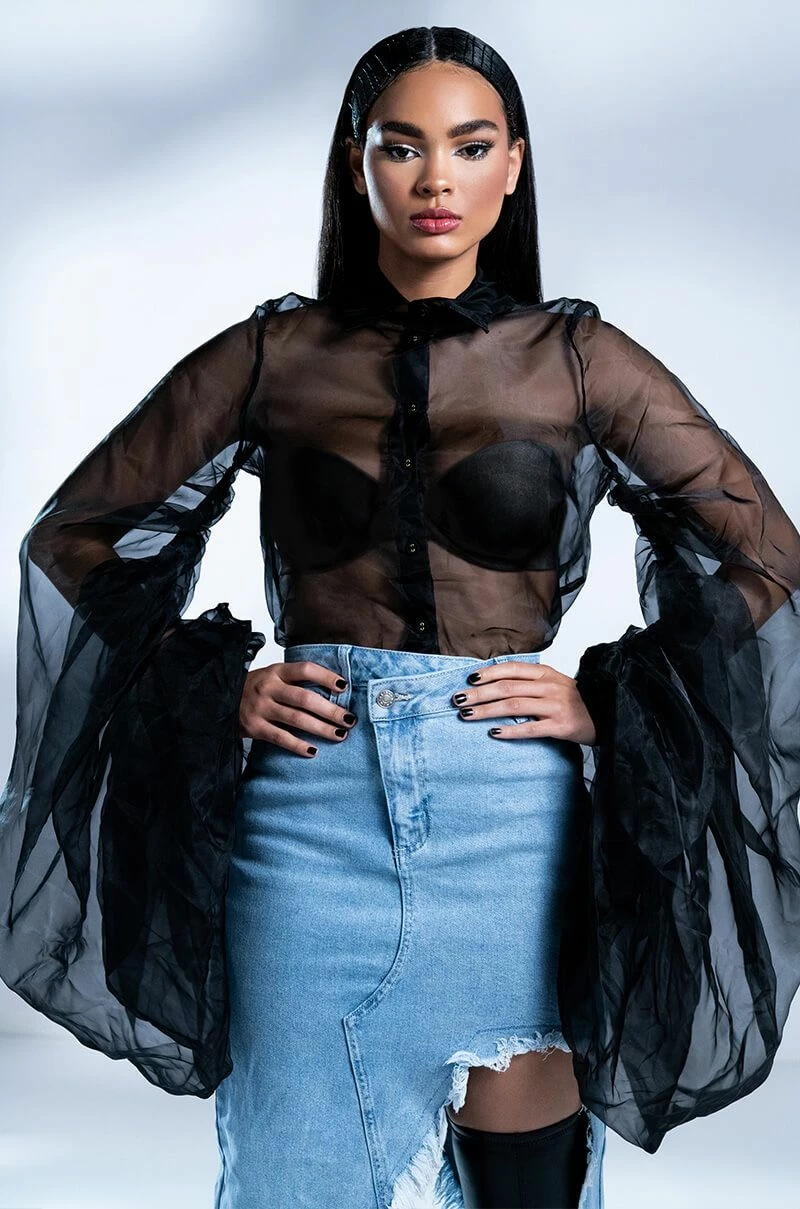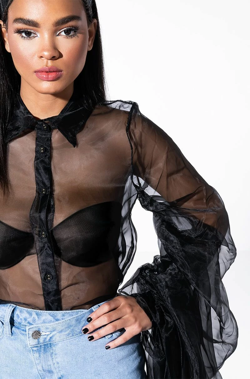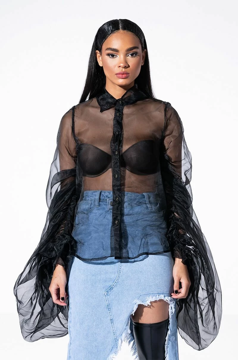 Celebrate in style with the AKIRA Label Joyeux Anniversaire Super Voluminous Sleeve Blouse! This lightweight top is made from a sheer chiffon fabrication and features a collared neckline, billowing, dramatic sleeves with ruched detailing, and a button down front closure. Style this voluminous piece over bralettes and trousers to complete your chic look.
