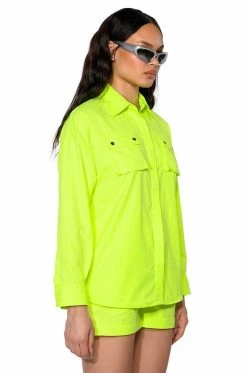 The AKIRA Label Kai Button Down Shirt is part of a flowy chic two-piece set, made from a lightweight, neon base fabrication. It features a pointed foldover collar, long sleeves with buttoned cuffs, snap buttoned flap front pockets with silver metallic detail, and a button down front closure. Complete with an oversized, long line silhouette. Style with the coordinating bottoms, The AKIRA Label Kai Pull On Shorts, and chunky boots for a bold, everyday look.
