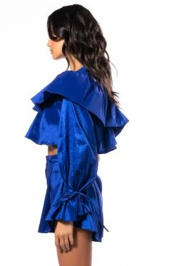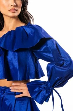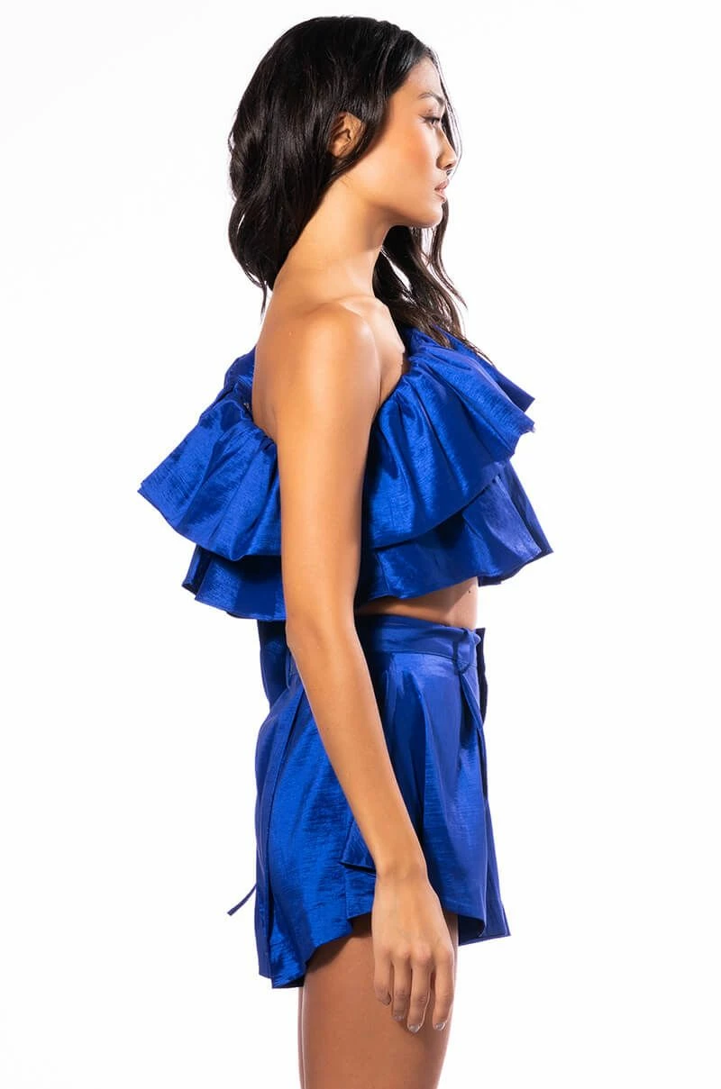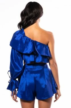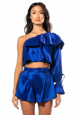 The AKIRA Label Kamila One Shoulder Stretch Taffeta Cropped Blouse is made from a lightweight, textured taffeta fabrication and features a one shoulder design with elastic and wide ruffle trim, a billowing long sleeve with ties, a ruffled bodice, a cropped silhouette, and an inner tank with an elastic hem. Complete with an exposed back zipper closure. Pair this piece with the matching AKIRA Label Kamila Stretch Taffeta Flouncy Short and platform sandals to finish off your flirty look.