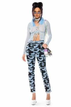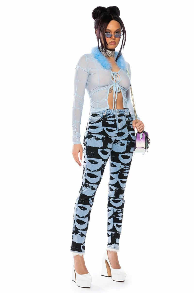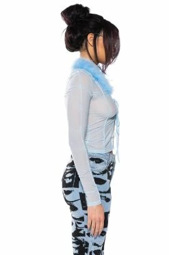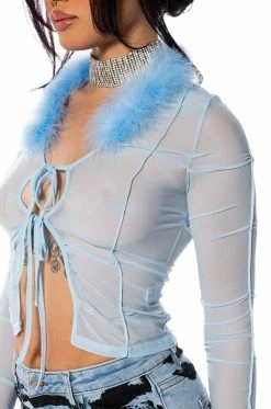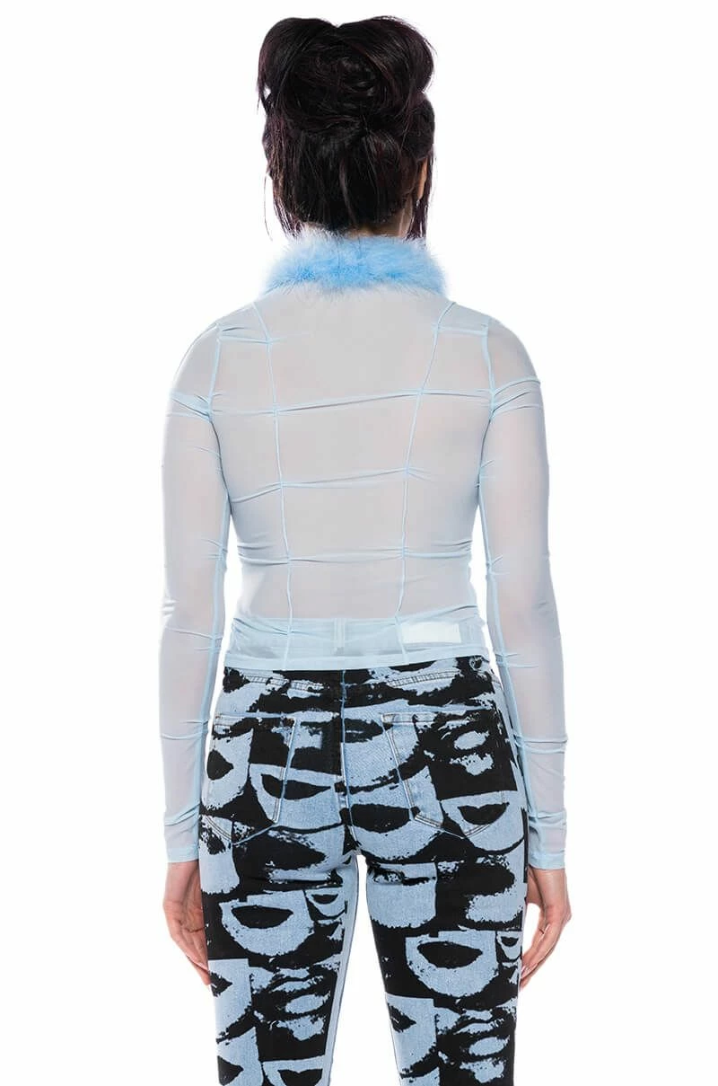 The AKIRA Label Keep My Attention Feather Detail Mesh Top features a sheer, mesh base fabrication, a stretch fit, open front silhouette, feather trim collar, and long sleeves. Complete with seam detailing throughout and a self-tie front closure.