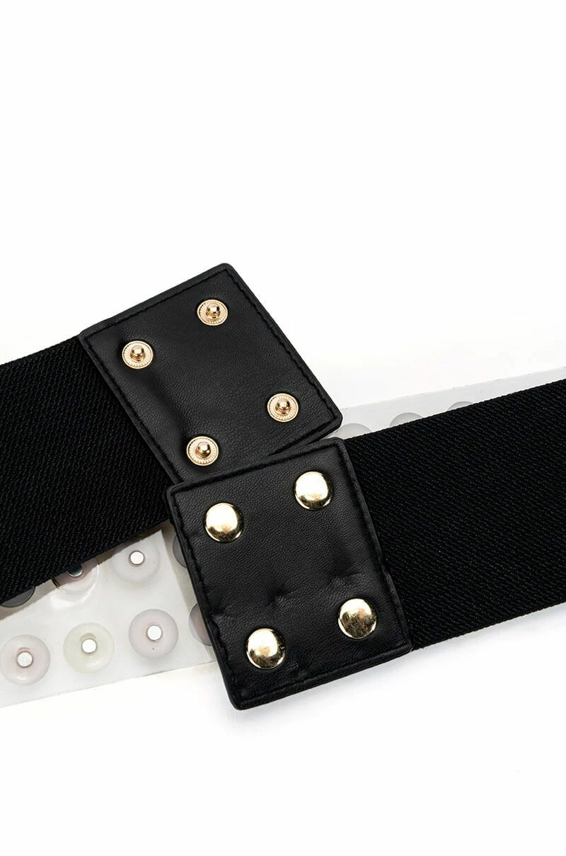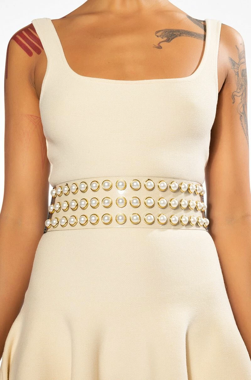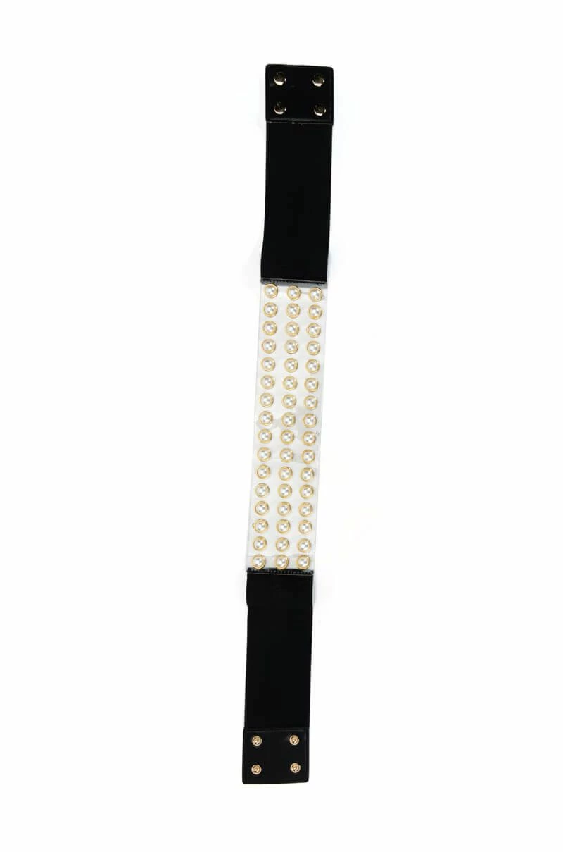 The AKIRA Label Kingston Pearl Stud Belt features a clear, wide front panel with pearl stud detailing, elastic side bands, and dual pop button back closures. This piece sits at the waist for a fierce, cinched look.