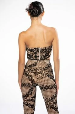 The AKIRA Label Lace Luxe Corset Top is made from a mesh fabrication and features a luxe, velvet-embossed lace print, a strapless, pointed neckline, boning for structure, a cropped silhouette, and a pointed hem. Complete with an exposed back zipper closure. Pair this piece with the coordinating AKIRA Label Lace Luxe Legging to complete your look.