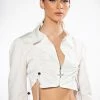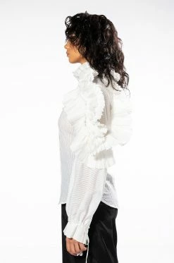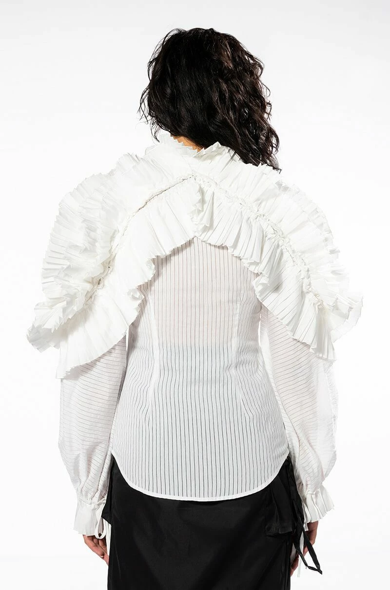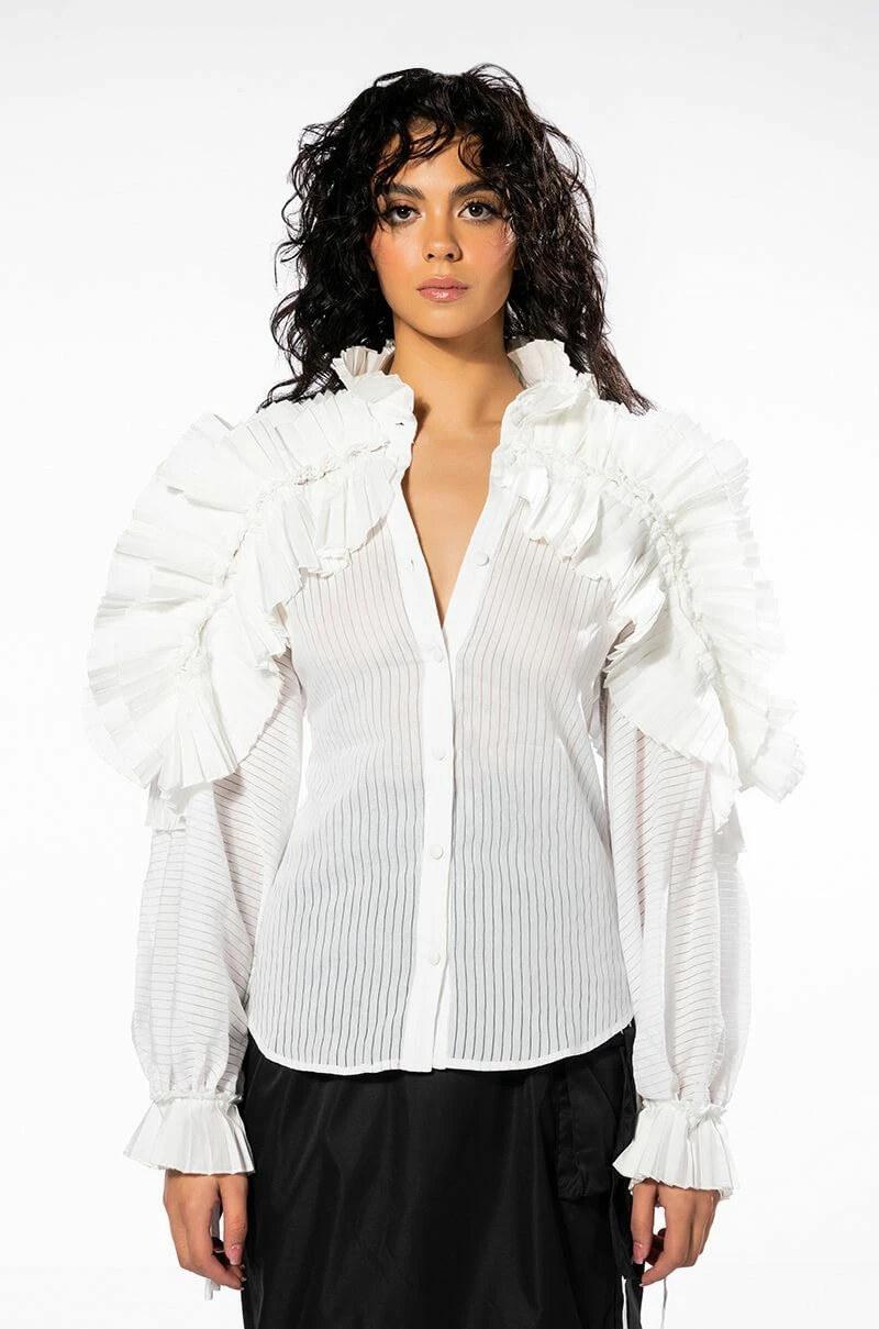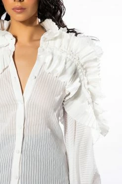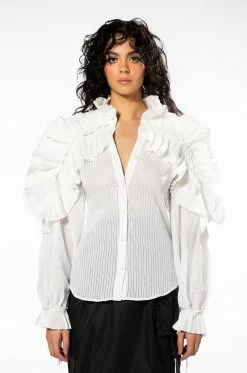 Sheβs a winner! The AKIRA Label Lady Luck Long Sleeve Ruffle Button Down Blouse is made from a striped, semi-sheer shirt fabrication and features a ruffled standing collar, dramatic ruffled shoulder detailing, long sleeves with tie-detailed ruffle cuffs, and a rounded hem. Complete with a button down front closure. Pair this piece with fitted trousers and patent leather pumps to finish off your tailored look.