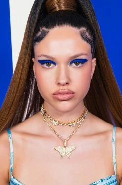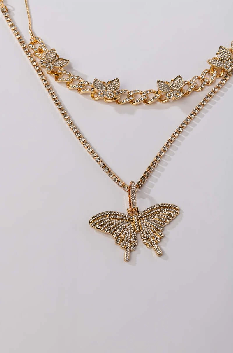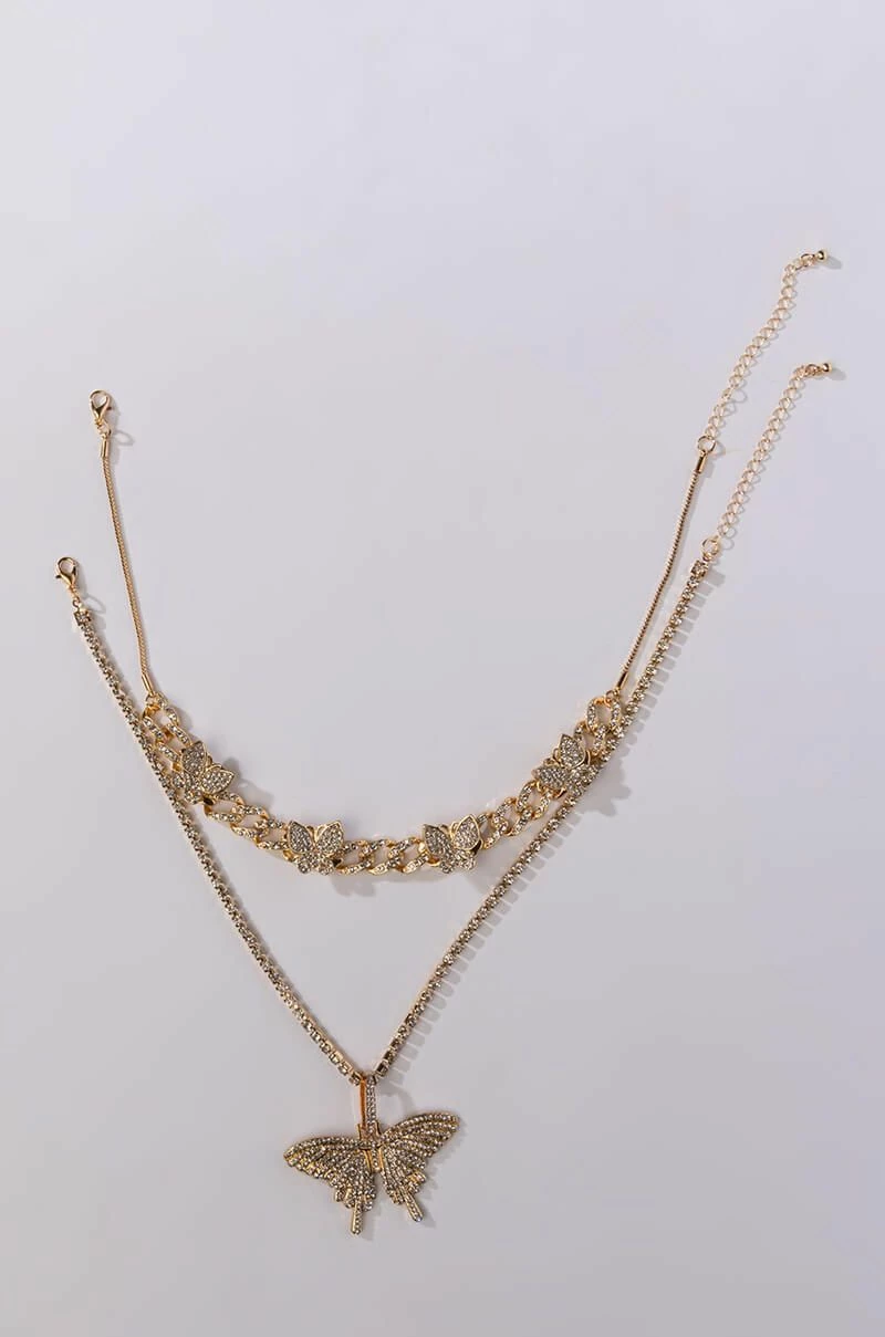 The AKIRA Label Lil Baby Butterfly Rhinestone Necklace is a set of two faux gold necklaces each featuring pave butterfly accents. One is a pave link chain choker necklace, the other is a rhinestone link necklace with an oversized pendant piece. Both are complete with adjustable lobster claw closures