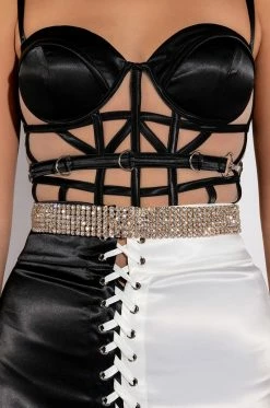 The AKIRA Label Live It Up Gold Rhinestone Belt is a rhinestone link accessory complete with a faux gold base, rhinestone link design, and adjustable lobster claw fastening.