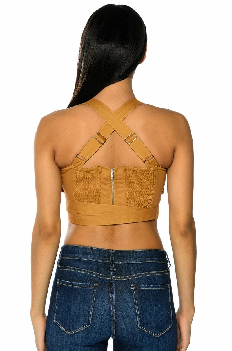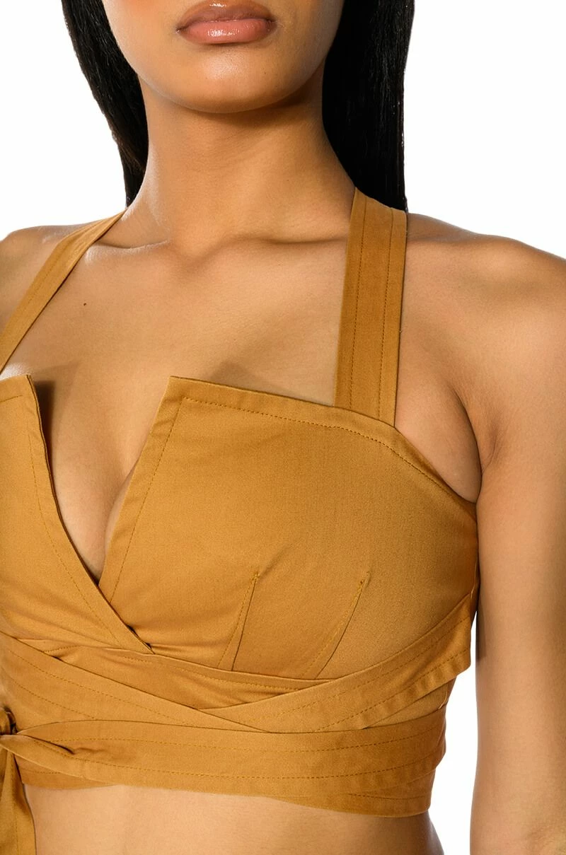 The AKIRA Label Londyn Cross Back Wrap Tank Top is made from a soft, structured base fabric and features a unique wrap front design, adjustable thick tank straps, and a V-cut neckline. Complete with wrap-around waist straps, cross back straps, scrunched elastic at the back for a comfortable fit, and an exposed back zipper closure. Pair this cropped top with the coordinating bottoms, The AKIRA Label Londyn Wide Leg Trouser, for an unbeatable London look!