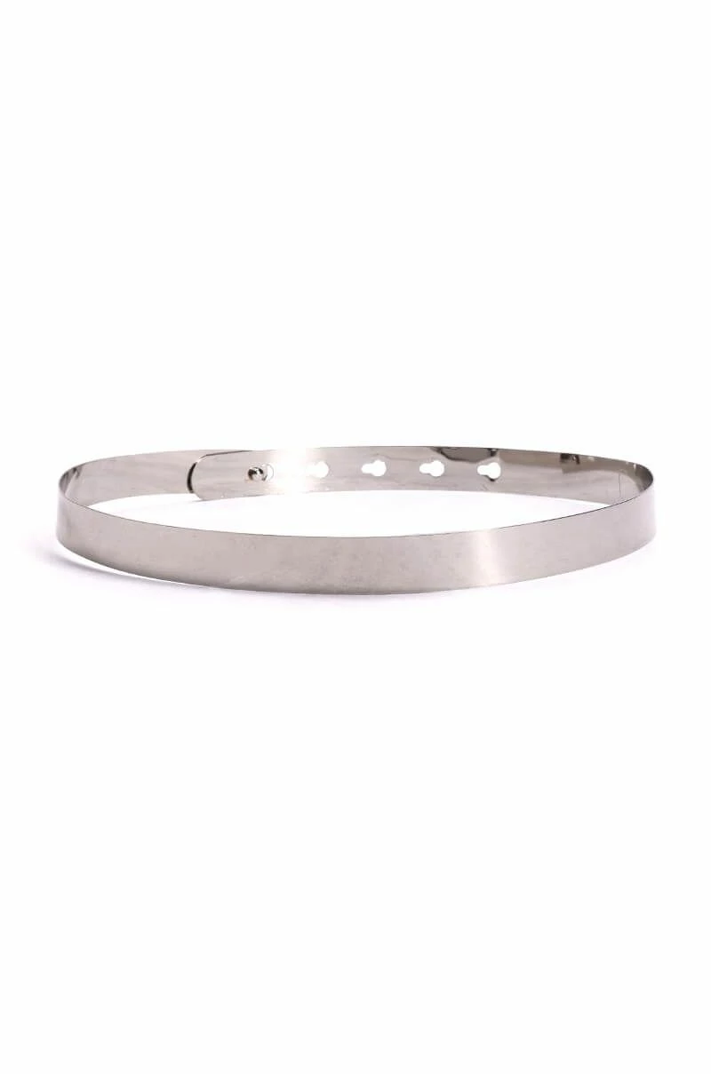 The AKIRA Label Long Night Metallic Waist Belt is made from a curved faux silver metallic base complete with an adjustable pop button closure. Sits at the waist for a form-flattering look.