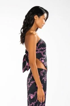 The AKIRA Label Love Lock Tie Back Blouse is made from a slick satin fabrication and features a graphic heart lock and chains print, a straight across neckline, strapless silhouette, princess seam detailing, cropped length, a pointed hem, and a tie back closure. Pair this piece with the matching AKIRA Label Love Lock Wide Leg Palazzo Pants and strappy sandals to complete your bold look!