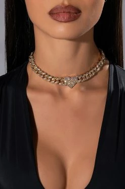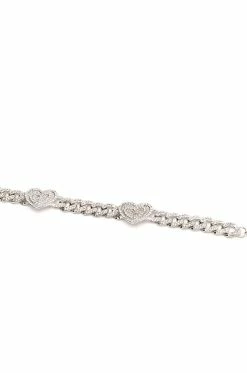 The AKIRA Label Lover Girl Rhinestone Chain Choker is made from a faux silver metal base and features a pave rhinestone curb chain with pave rhinestone heart charms and an adjustable lobster claw closure.