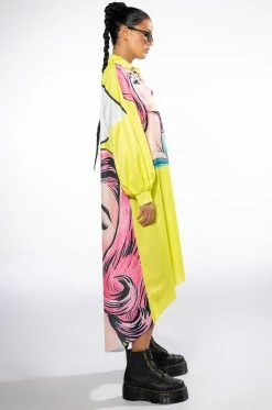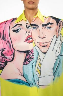 The AKIRA Label Lovers Long Button Down Blouse features a bold pop art print, a smooth shirting fabrication, a collared neckline, long sleeves, a maxi length silhouette, and button front closures at the chest. Pair this punchy piece with denim shorts and thigh high boots for a complete look.