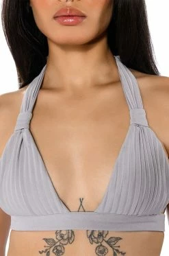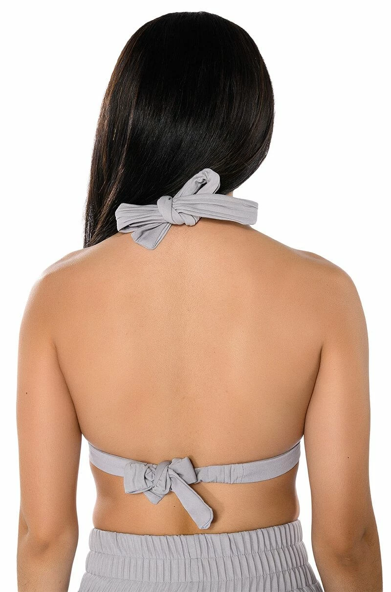 The AKIRA Label Lucy Bralette is a part of an elegant 3-piece set, and is made from a pleated polyester fabrication. Complete with a halter neck tie silhouette, triangle pleated cups, and a sleek, wrap around tie-back band. Pair with the coordinating AKIRA Label Lucy High Rise Wide Leg Pant, Lucy Short Sleeve Button Down, and booties for a finished chic, executive look.
