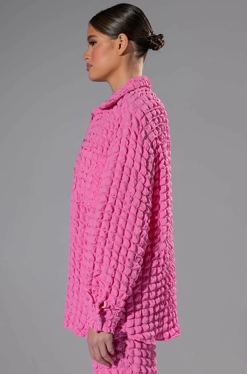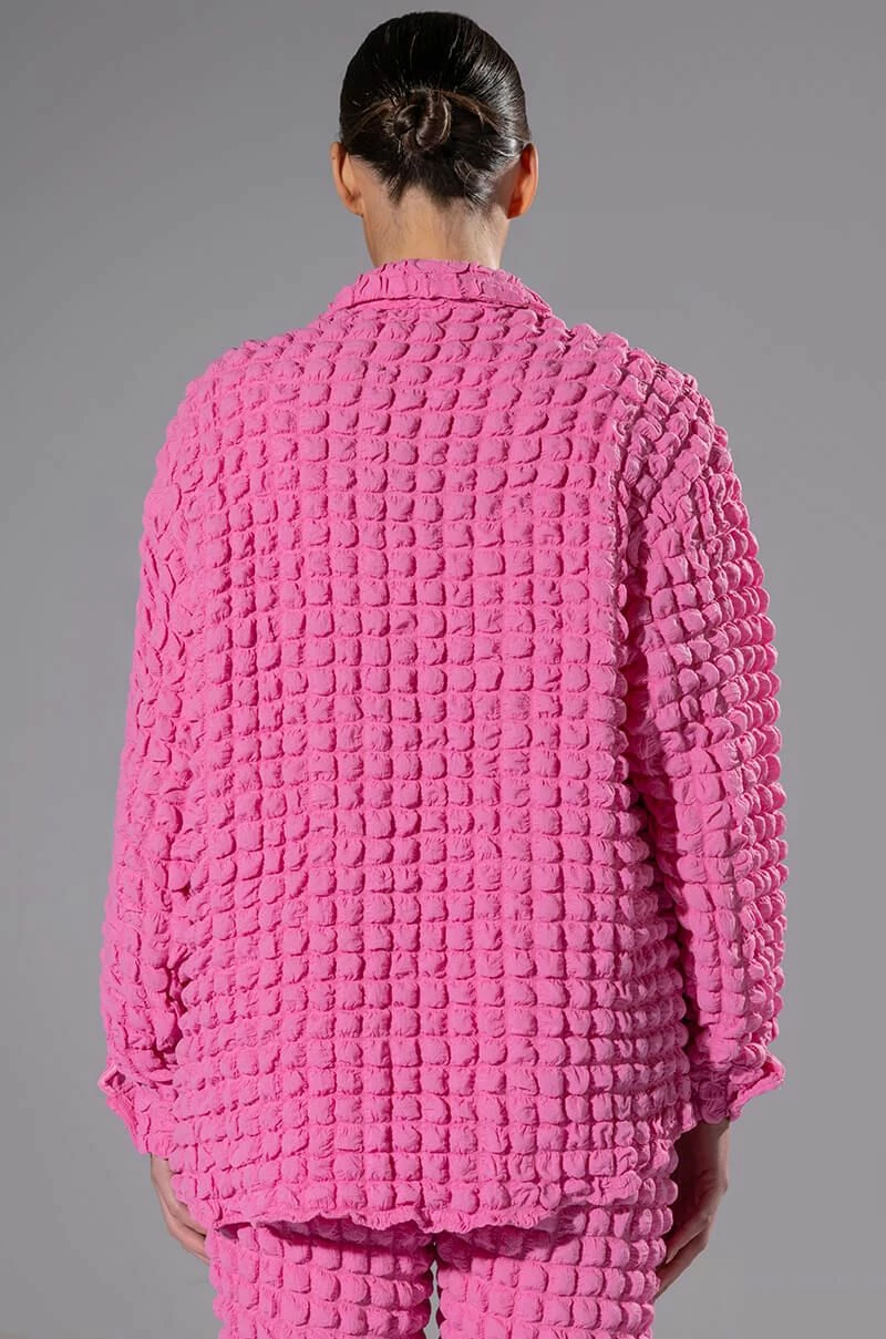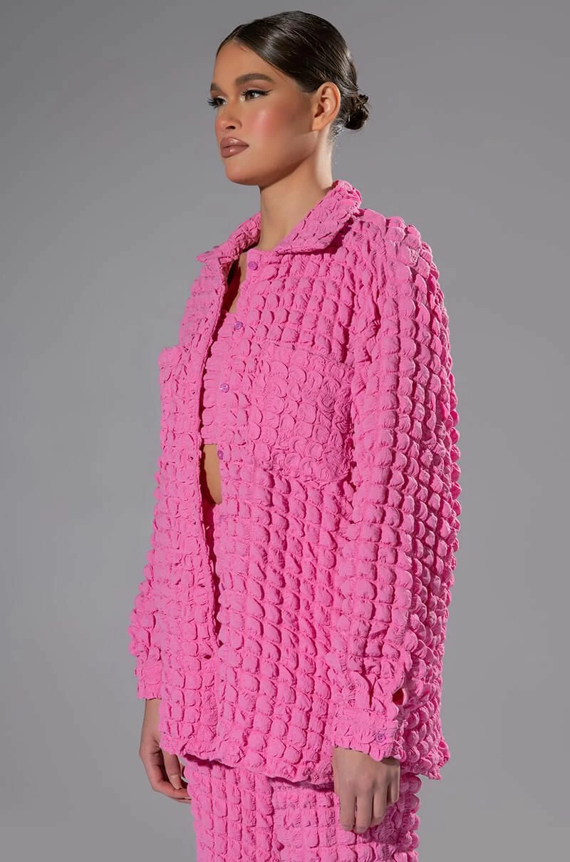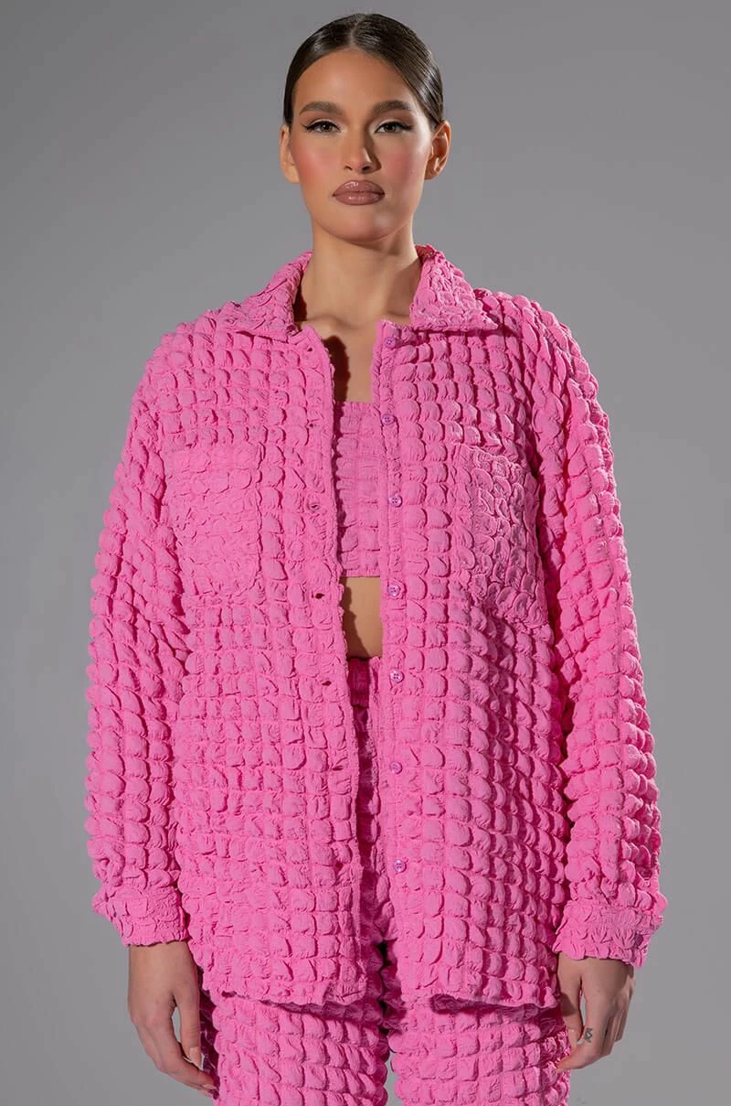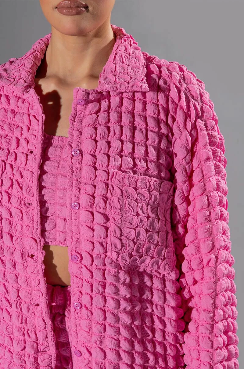 The AKIRA Label Lucy Textured Button Down Blouse is made from a stretchy popcorn fabrication and features a collared neckline, long sleeves with buttoned cuffs, chest patch pockets, a boxy fit, and a button down front closure. Pair this piece with the matching AKIRA Label Lucy Textured Crop Tank Top and Lucy Textured Wide Leg Pant to complete your look.