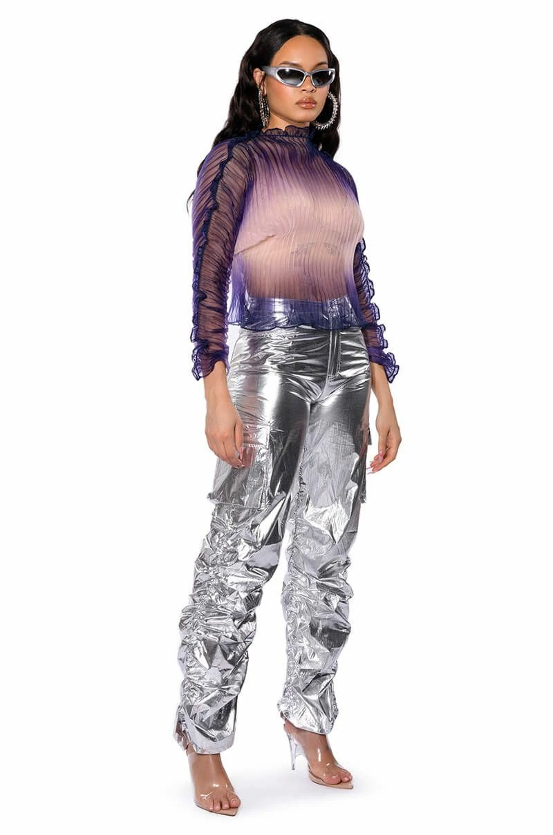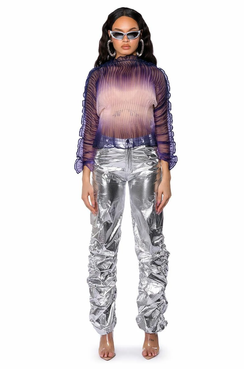 The moment. The AKIRA Label Maeve Pleated See Through Long Sleeve Top is here! This sheer, luxe top is made from a pleated chiffon base and features a high neck, long ruched sleeves, and a beautiful, ombre design. Complete with a pull on fit and lightly ruffled seaming trim along the arms and neck. Style with relaxed parachute pants and chunky slides for an off-duty look.