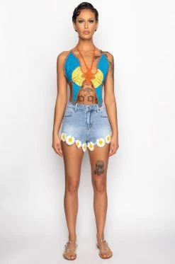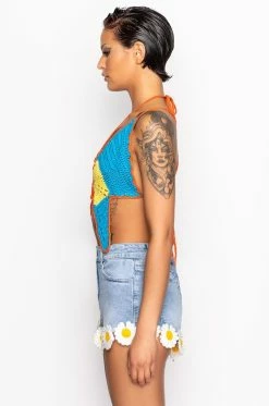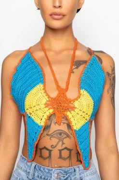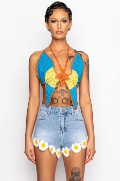 Soar in style with The AKIRA Label Mariposa Crochet Halter Top! This patterned piece is made from an unlined crocheted base and features a halter tie neckline, a multicolor butterfly design, cropped length, and a sexy open back with self ties. Pair this piece with high waisted bottoms and strappy sandals for a flirty, colorful look!