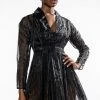 The AKIRA Label Marley Ultra Long Crochet Fringe Blouse is made from an unlined crochet base and features a tie halter with opaque rings, a plunging neckline with a crochet bar below the chest, a sleeveless silhouette, thin metal cylinder waist belt detailing, a sexy open back, and ultra long fringe trim. Complete with a tie back closure.
