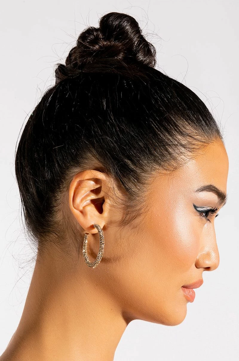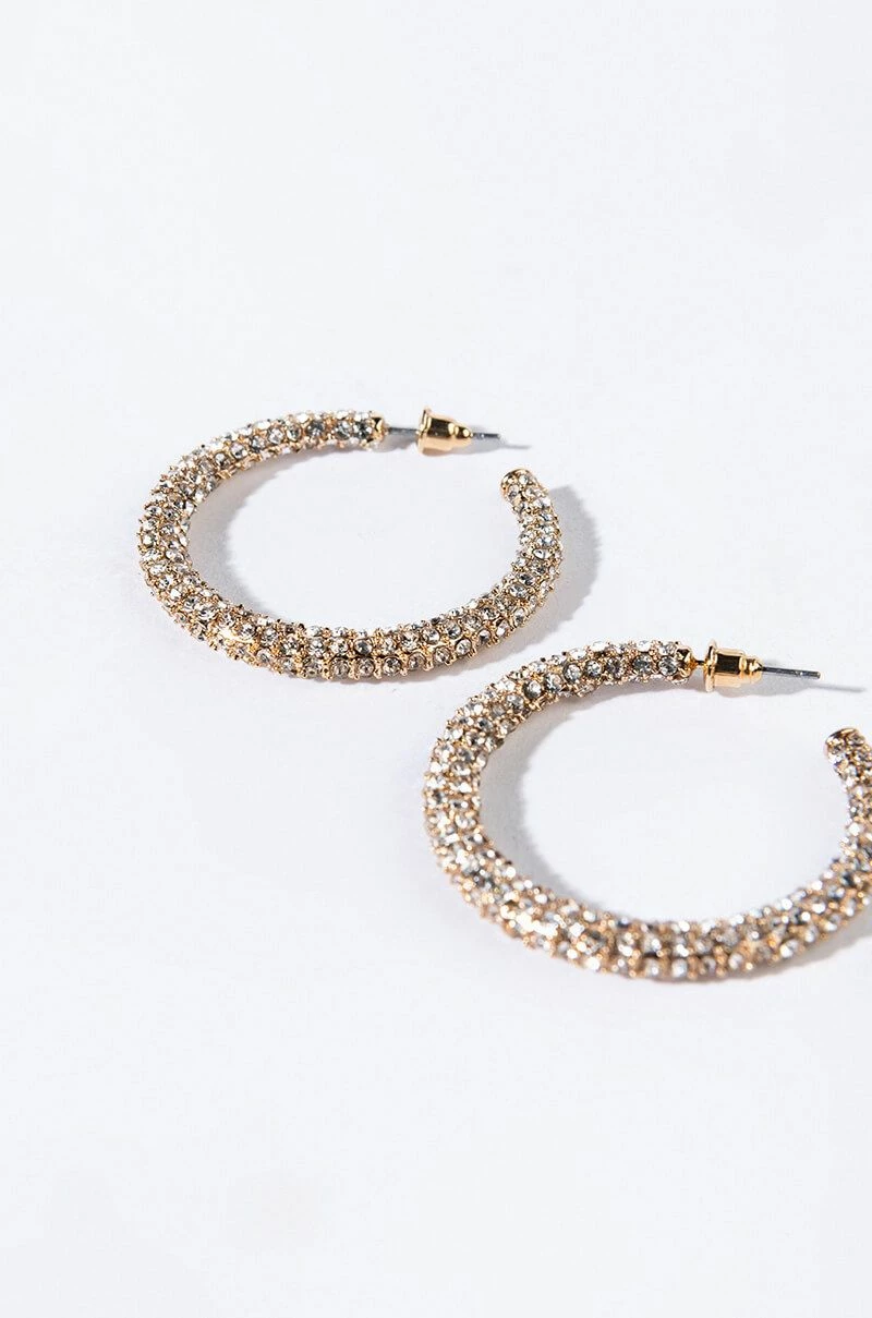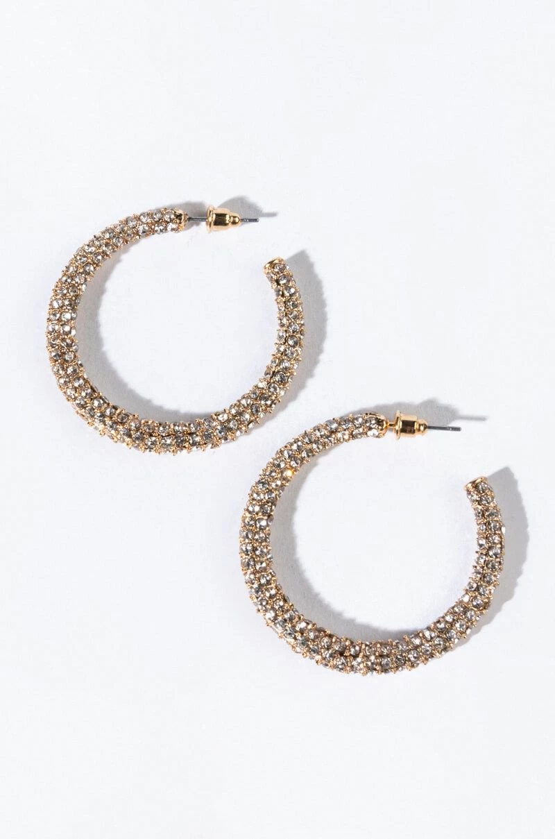 The AKIRA Label Maya Medium Rhinestone Hoops are a midsize hoop earring featuring a rhinestone embellished faux gold metallic design, a circular silhouette, an open back, and a post back fastening.