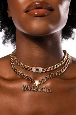 The AKIRA Label Melanin Babe Layered Necklace is made from a faux gold base and features two Cuban link chains: one with a gem-embellished charm, and the other with a fierce “Melanin” text nameplate pendant. Complete with an adjustable lobster claw closure. Work that melanin, babe!