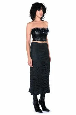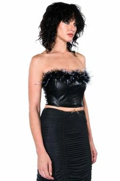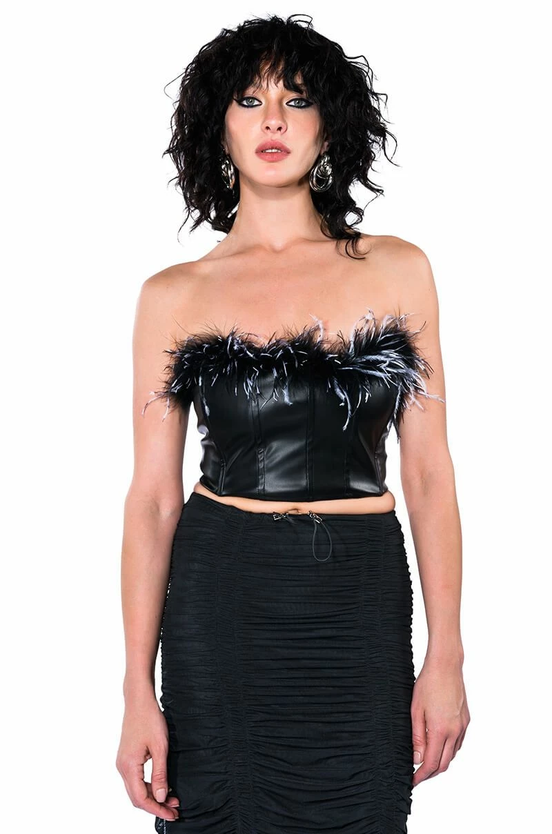 Seize the moment with The AKIRA Label Melinda Feather Detail Top! This sexy yet cute top features a sleek, vegan leather base fabrication, opulent feather trim, and boning for structure. The strapless and bodycon silhouette has an exposed zipper back closure. Pair with a mini skirt and knee-high boots or with relaxed cargos and chunky heels to complete your glam look!