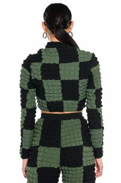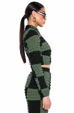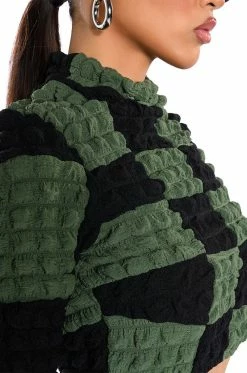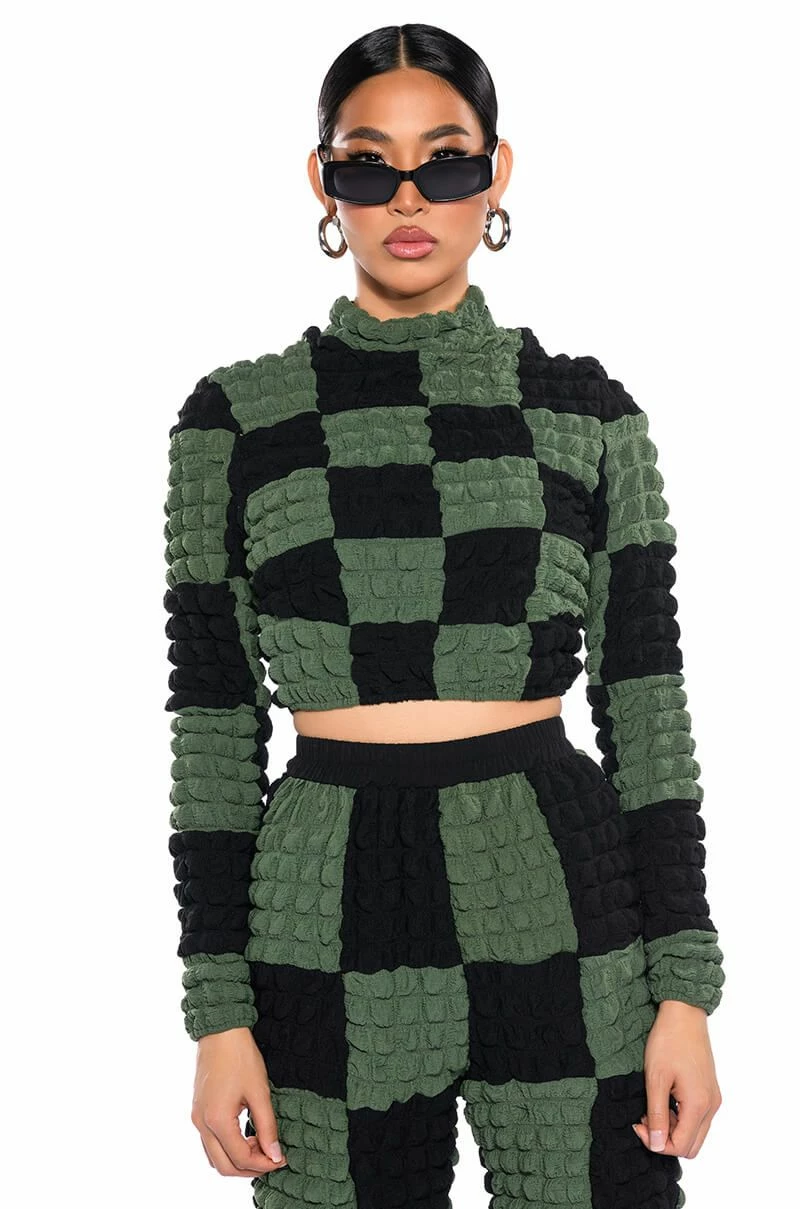 The AKIRA Label Met You In San Francisco Colorblock Puff Crop Top is made from an unlined, popcorn-textured fabrication and features colorblock checker patterning, a mock neckline, long sleeves, a cropped silhouette, and elastic hems. Pair this piece with the matching AKIRA Label Met You In San Francisco Colorblock Puff Wide Leg Pant and booties to complete your look.