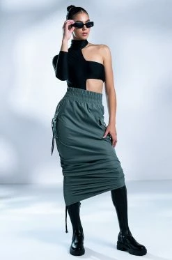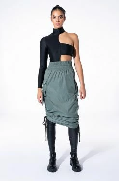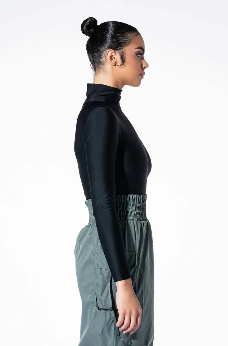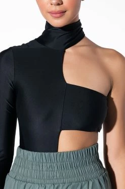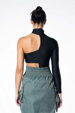 The AKIRA Label Mia Bandeau Detail Mock Neck Bodysuit is made from a slick, stretchy fabrication and features a mock neckline, a long sleeve, and a sexy bandeau bodice detail. Complete with a cheeky bottom fit and a snap gusset closure.