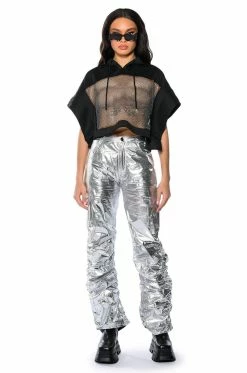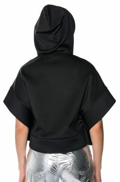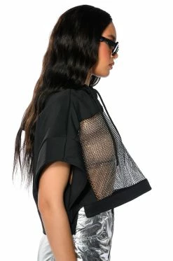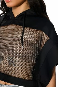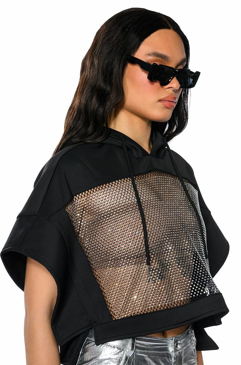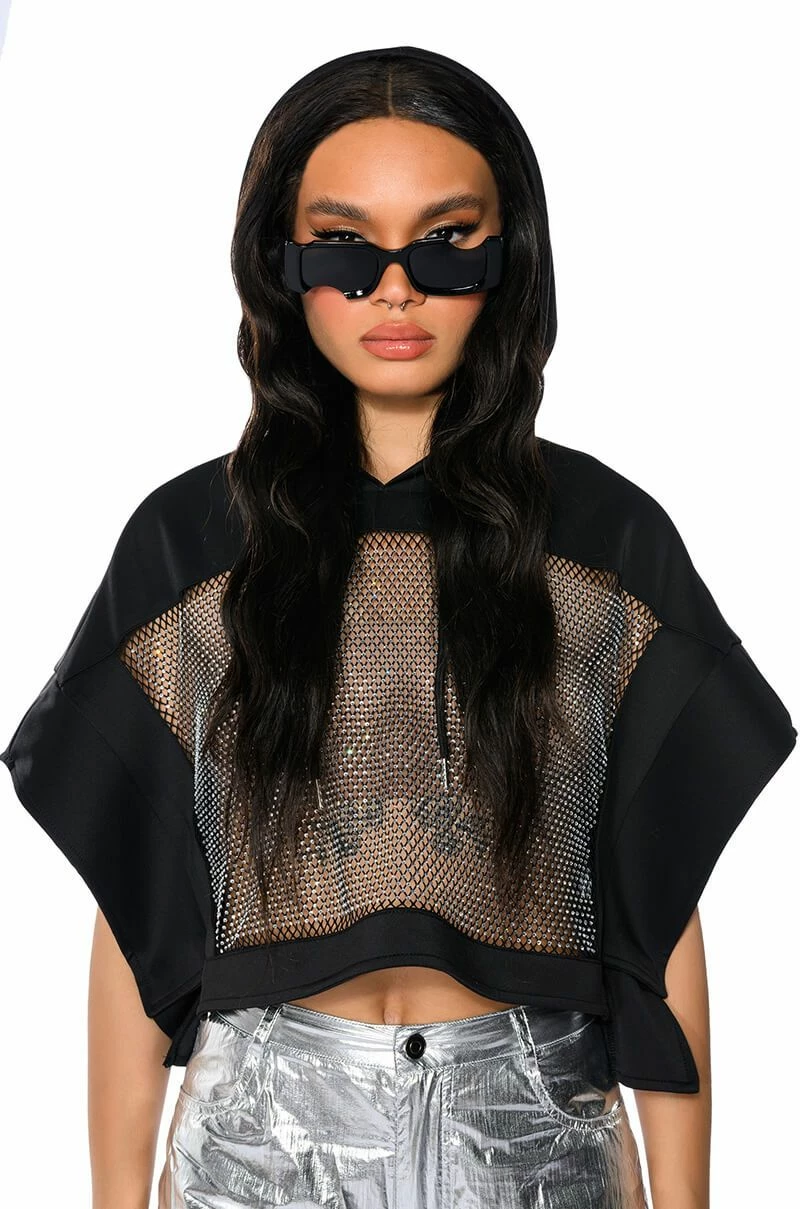 The AKIRA Label Midnight Calls Cropped Hoodie is made from a slick sweatshirt fabrication and features an attached drawstring hood, short dolman sleeves, a sheer front rhinestone mesh panel, a cropped silhouette, and open sides with snap button closures. Pair this fresh athleisure piece with cargo joggers and sneakers to complete your look.
