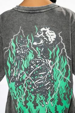 The AKIRA Label Mind Control Crewneck Sweatshirt is an oversized soft cotton poly blend top featuring a washed, worn-in look, a crew neckline, ribbed knit trim, and graphic screen print patterning. Displays “Mind Control,” gothic text, rhinestone-embellished lighting, and a flaming planet at the chest. Flames dance along the sleeves, and a flaming skeleton is shown across the back. Pair with joggers and high top sneakers for a complete, cozy look.