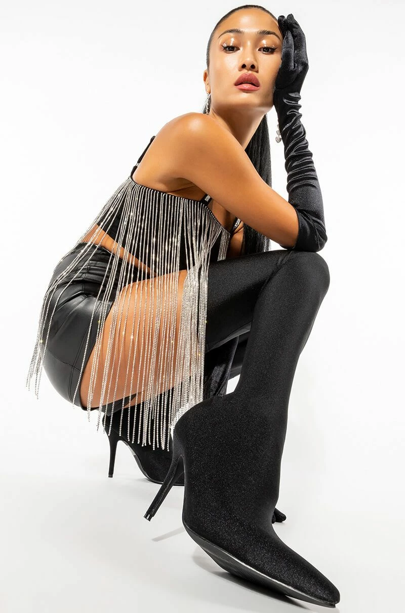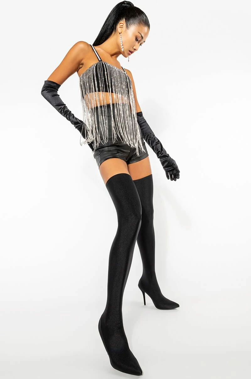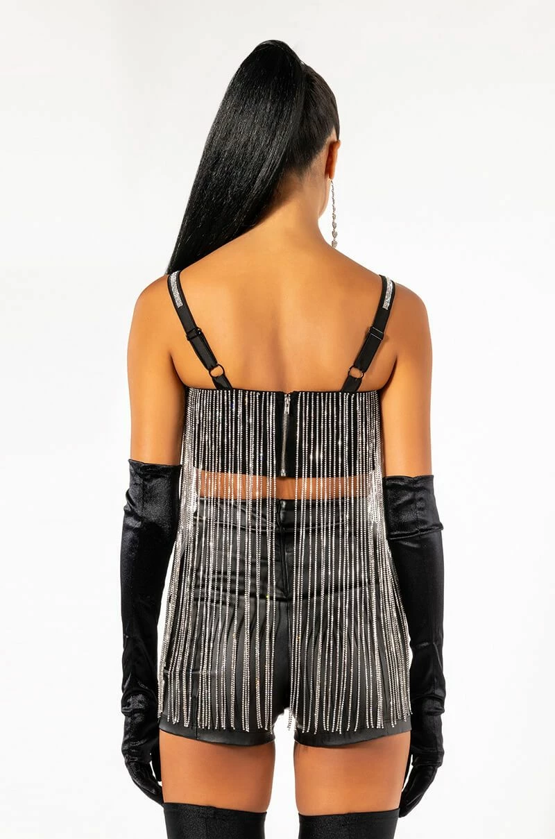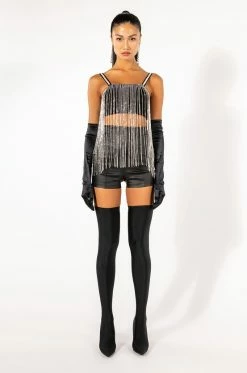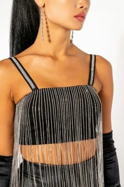 The AKIRA Label Mooncatcher Rhinestone Fringe Sleeveless Cropped Blouse is made from a slick knit fabrication and features adjustable tank straps with rhinestone column trim, a straight neckline with long rhinestone fringe trim and silicone grip strips, princess seam detailing, and a cropped silhouette. Complete with an exposed back zipper closure. Pair this glitzy piece with fitted trousers, pumps, and a rhinestone clutch for all the glitter and glam!