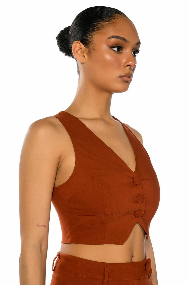 The AKIRA Label Most Likely To Dream Big is made from a smooth, lightweight fabrication and features a plunging neckline, a sleeveless silhouette, princess seam detailing, and a front button closure. Complete with pointed hems, a satin inner lining, and faux front pockets. Style this cropped piece with the matching AKIRA Label Most Likely To Dream Big High Waisted Pants to finish off your look.