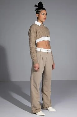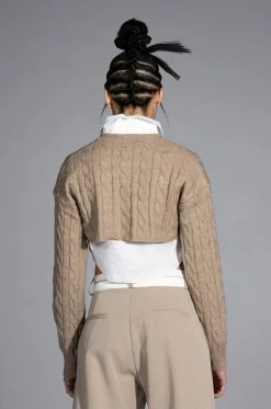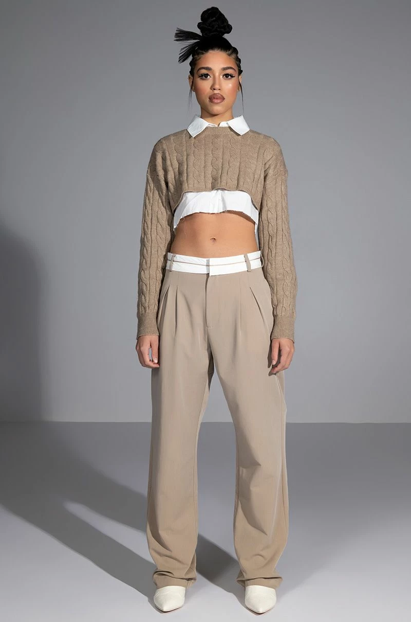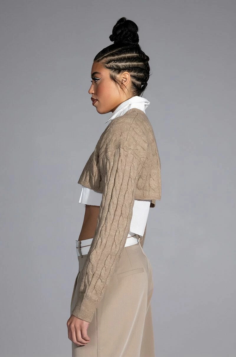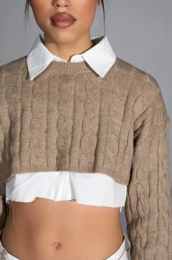 The AKIRA Label Most Likely To Succeed Layered Crop Sweater is a soft cable knit sweater featuring a raw cropped cut, long sleeves, a crew neckline, and an inner contrast button down. Complete with a fold over collar, a chest pocket, long cuffed sleeves, and a raw cropped hemline. Complete your look with a mini skirt, knee high socks, and mary jane pumps for a modern school girl-inspired look.