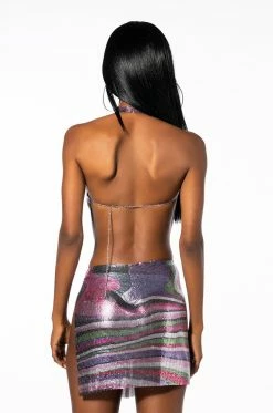 The AKIRA Label Move Your Body High Shine Chainmail Top is made from a multicolor, striped psychedelic print chainmail base and features a halter with hook eye back closures, a plunging cowl neckline, a pointed hem, a handkerchief top design, and an open back with an adjustable chain link lobster claw closure. Style this piece with the coordinating AKIRA Label Move Your Body Chainmail Mini Skirt and platform sandals to complete your look.