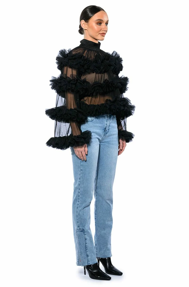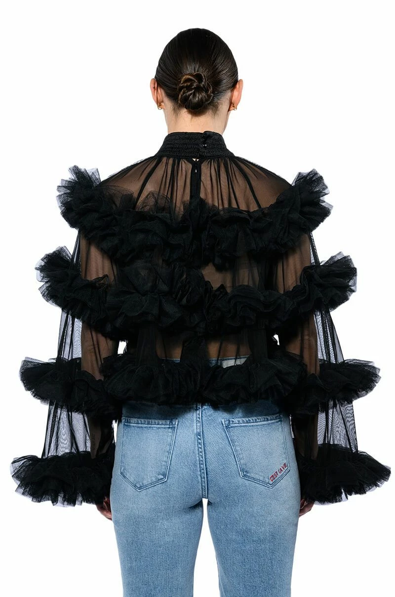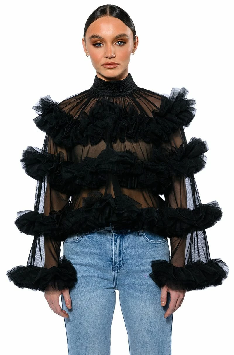The AKIRA Label Uniquely You Ruffle Statement Top is made from a sheer mesh fabrication and features a shirred button back mock neckline, layered ruffle body detailing, long sleeves, a cropped silhouette, and a tonal back zipper closure. Pair this piece with fitted bottoms and booties to complete your bold look.
