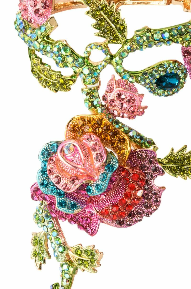 The AKIRA Label My Secret Garden Luxe Gem Bracelet Ring Combo is an ultra-ornate statement piece featuring a metallic construction and a vibrant rhinestone-encrusted climbing vine-inspired bracelet base. This intricate piece includes a floral motif that travels along the hand, culminating in a teardrop rhinestone-embellished ring. Complete with elastic backing, this one-size-fits-most piece stretches to slip on the wrist.