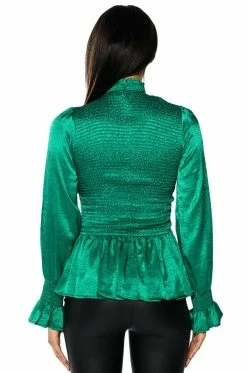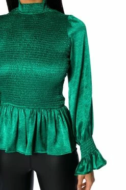 The AKIRA Label Lady Luck Mock Neck Smocked Satin Blouse features a shimmering satin fabrication, a mock neckline, long sleeves, smocked detailing, and a peplum hem. Complete with a waist length silhouette, smocked cuff detailing, and a tonal back zipper closure. Pair this piece with dark wash denim and pointy toe ankle booties for a sleek, chic ensemble.