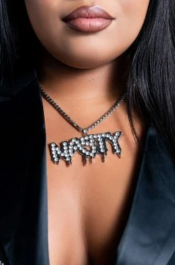 The AKIRA Label Nasty Rhinestone Necklace is a fierce, blinged-out necklace made from a faux silver metal featuring a rhinestone chain link base, a drippy rhinestone-detailed βNASTYβ text metal nameplate pendant, and an adjustable lobster claw closure.