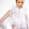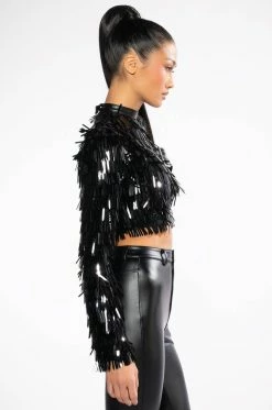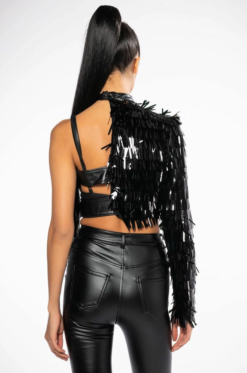 The AKIRA Label Neo One Sleeved Buckle Top is made from a sequin fringe-detailed fabrication and features a mock neckline, a one sleeve design, adjustable buckled leather straps along the neck, chest, and waist, and a cropped silhouette.