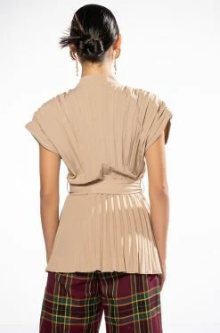The AKIRA Label New Me Button Down Blouse is a chic pleated blouse featuring short cap sleeves, a front button up enclosure, a mandarin neckline, a longline silhouette, and a pleated construction. Complete with a cinched elasticized waistband, functional belt loops, and a coordinating waist belt.