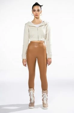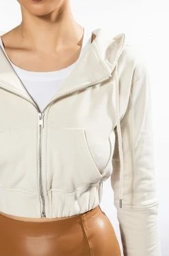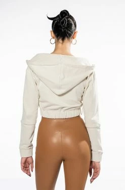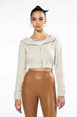 The AKIRA Label New Rules Crop Hoodie features a classic cotton blend fabrication, a cropped length, a drawstring hood, a ribbed elastic waistband, and a front zipper closure. Complete your look with a cropped bralette and cozy joggers.