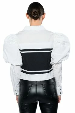 Read all about it! The AKIRA Label News To You Button Down Blouse is made from a classic cotton and features a collared neckline, long sleeves with puffed shoulders and wide, rhinestone-detailed heart button cuffs, geometric colorblock body paneling, a slightly cropped silhouette, and reflective square snap button front closures.