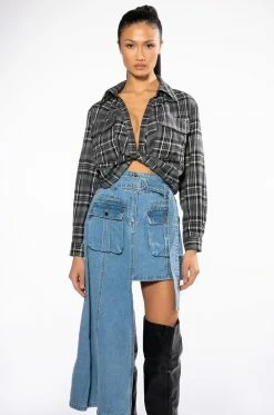 The AKIRA Label No Fronting Cropped Twist Front Plaid Top is made from a cozy flannel fabrication and features a plaid print, a collared neckline, long sleeves with button cuffs, large chest flap pockets, a cropped silhouette, and a twist front hem.