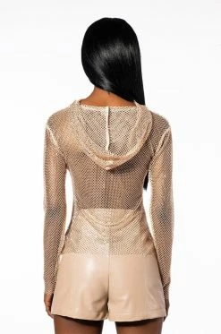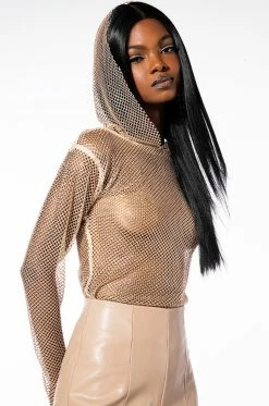The AKIRA Label North Star Rhinestone Mesh Hooded Top is made from a glistening rhinestone mesh base and features an attached hood, a high, rounded neckline, and long sleeves. Layer this piece over bralettes, mini dresses, and more to add bold bling to your look!