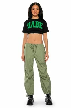 The AKIRA Label Not Your Babe Cropped Short Sleeve Crew Neck Tshirt is made from a stretchy cotton fabrication and features a crew neckline, short, boxy sleeves, “BABE” uppercase felt patch varsity lettering, a cropped silhouette, and a wide elastic band hem. Pair this sassy cropped tee with joggers and chunky sneakers to finish off your cutesy athleisure look.