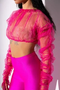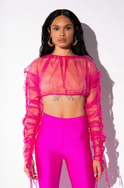 The AKIRA Label Old English Organza Micro Blouse features a floaty, sheer fabrication, an ultra-cropped hem, long voluminous ruched sleeves, and adjustable tie up drawstring cuffs. Complete with a square neckline, elastic trim, and a pull on fit.