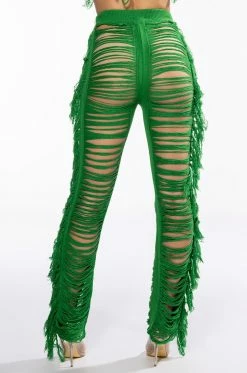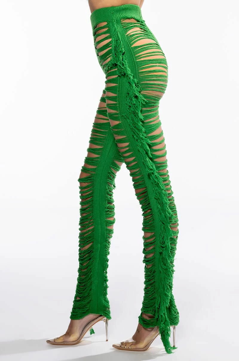The AKIRA Label On The Border Knit Bralette And Pants Set is made from an unlined knit base and features a bralette and pants. The bralette features a tie halter, a triangular bralette silhouette, fringe hems, and a tie back closure. The pants feature a high rise waist, a covered elastic waistband, skinny fit shredded legs with fringe trim, and a pull-on silhouette. Pair this set with the coordinating AKIRA Label On The Border Knit Top to complete your look.