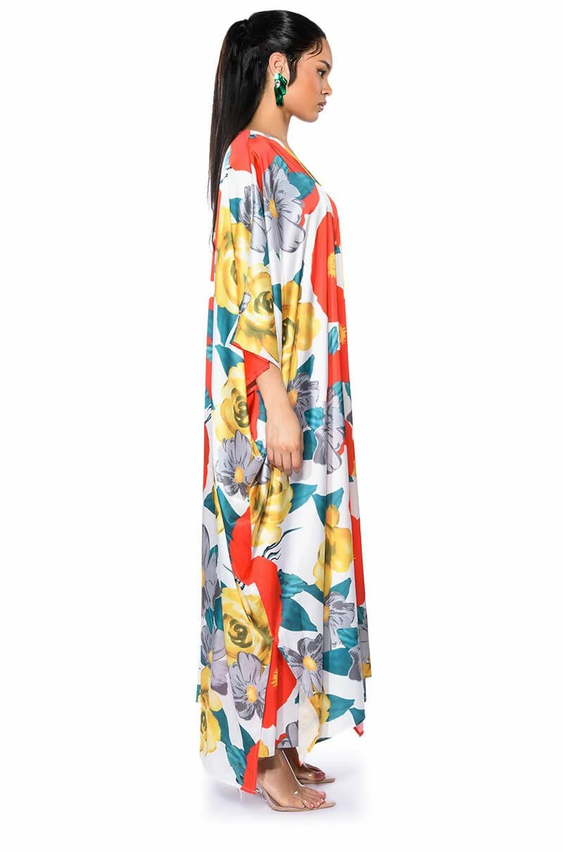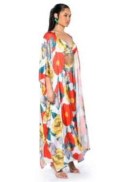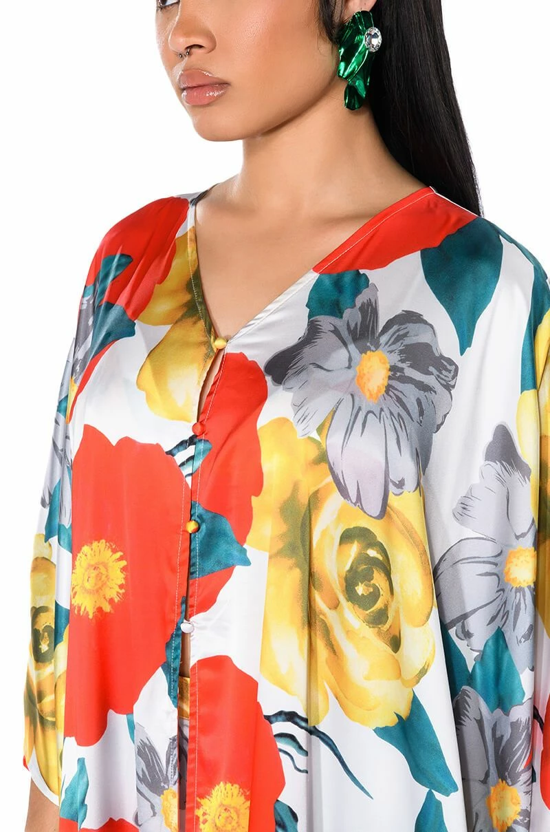 The AKIRA Label On The Patio Kaftan is made from a slick satin fabrication and features a vintage-inspired floral print, a V neckline, a longline kaftan silhouette, a long front slit, and button down front closures. Pair this piece with the matching AKIRA Label On The Patio Triangle Bralette and On The Patio Palazzo Pants to complete your chic lounge-ready look.