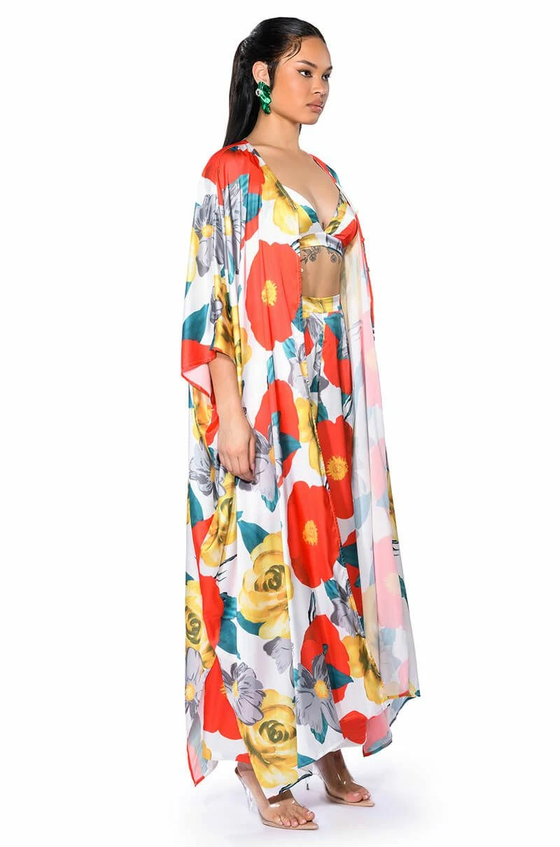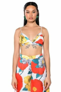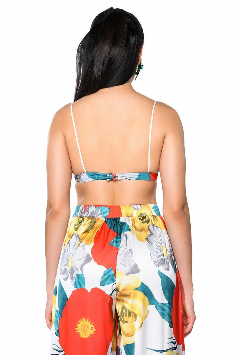 The AKIRA Label On The Patio Triangle Bralette is made from a slick satin fabrication and features a vintage-inspired floral print, ultra thin elastic tank straps, a triangular bralette silhouette, a cropped length, and button back closures. Pair this piece with the matching AKIRA Label On The Patio Palazzo Pants and On The Patio Kaftan to complete your chic lounge-ready look.
